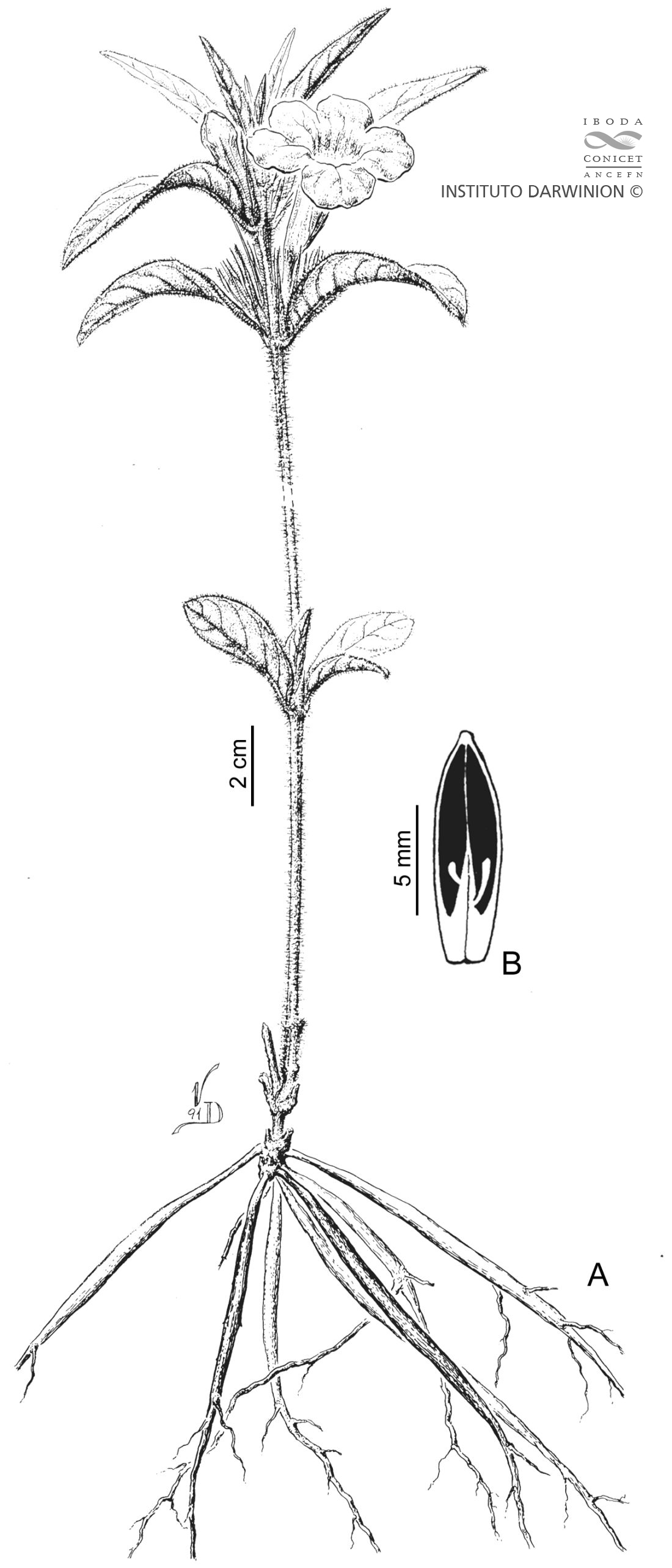 Hierba sufruticosa hasta de 30 cm de alto, naciendo de un rizoma leñoso, con raíces fusiformes, gruesas, carnosas. Tallos erectos, hasta de 30 cm de largo, velutino-pubérulos. Hojas cortamente pecioladas; láminas angostamente oblongas o lanceoladas, de 5-9 × 1,5-2 cm, agudas y cuneadas, gríseo velutino-tomentosas, las inferiores algo más cortas y obtusas. Flores sésiles, solitarias o de a 2 en las axilas de las hojas superiores; bractéolas obsoletas; cáliz de 2 cm de largo, los lóbulos lineales, ca. 1,5 mm de ancho, pubescentes, densamente ciliados; corola azul pálida, de 5-7 cm de largo, con el tubo basal de 1,5-2 cm de largo, la garganta de 2,5-3,5 cm de largo y los lóbulos orbiculares, patentes, ca. 2,5 cm de diámetro; estambres inclusos, con anteras ca. 3 mm largo; ovario y estilo glabros. Cápsulas obovoides, de 1 cm de largo × 0,8 cm de grosor, pubérulas. Semillas 2-4, de 3 mm de diámetro, adpreso-pubérulas, densamente mucilaginosas al mojarse; retináculos de 3 mm de largo.