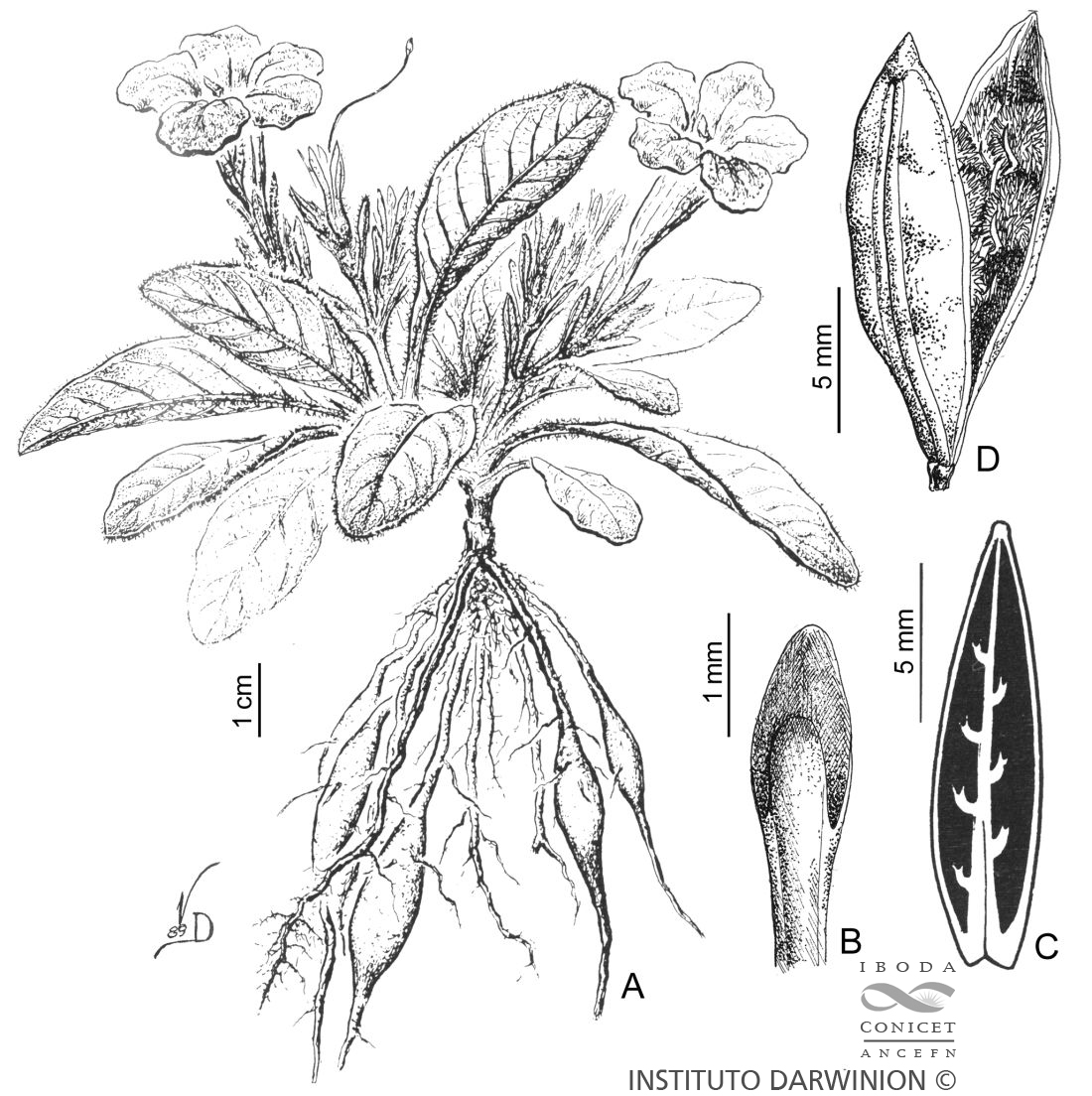 Hierba perenne, acaule, con raíces carnosas, fusiformes. Hojas en roseta, cortamente pecioladas; láminas ovadas, oblongo-ovadas u obovadas, de 3-9 × 1-3 cm, glabras a levemente hirsutas, obtusas y redondeadas en el ápice, decurrentes sobre el pecíolo en la base. Flores cortamente pedunculadas, solitarias y con 2 bractéolas en la base, o en dicasios paucifloros; pedúnculos hasta de 3 cm de largo, glabrescentes; bractéolas lineales y pubérulas; pedicelos hirsuto-pubescentes; cáliz de 1,2-2,2 cm de largo, con los segmentos lineales, agudos, de 1-2 × 0,1-0,2 mm, densamente pilosos y ciliados en el margen; corola blanca, a veces con tintes lilacinos o amarillentos, de 3-5 cm de largo, con el tubo basal de 1-1,5 × 0,2 cm, garganta obcónica de 1,2-1,5 cm de largo × 8 mm de diámetro; lóbulos reflejos, suborbiculares, de 1-1,5 cm de diámetro; estambres inclusos, anteras ca. 2 mm de largo. Cápsulas angostamente elipsoides, algo más cortas que el cáliz, de 1,3-1,8 × 0,4 cm, huecas casi hasta la base. Semillas 10-14, de 2-3 mm de diámetro, adpreso-pilosas sobre la superficie, mucilaginosas al mojarse; retináculos de menos de 2 mm de largo.