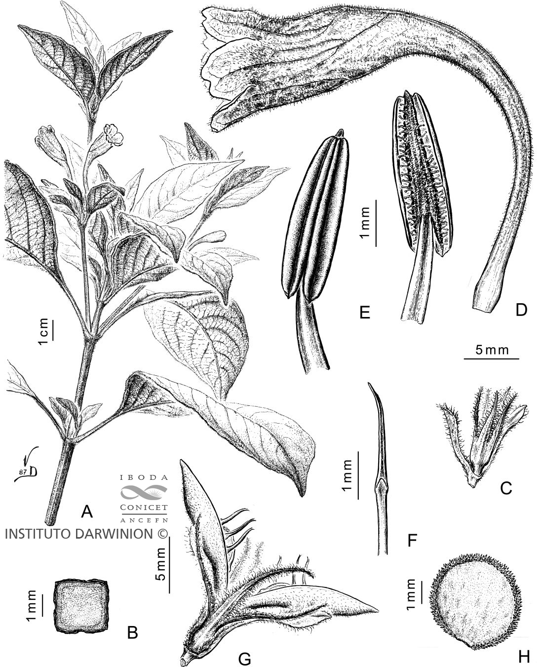 A. Rama florífera. B. Corte de tallo 4-angular. C. Cáliz con bractéolas. D. Corola. E. Estambres en vista ventral y dorsal. F. Estigma. G. Cápsula abierta con retináculos. H. Semilla.