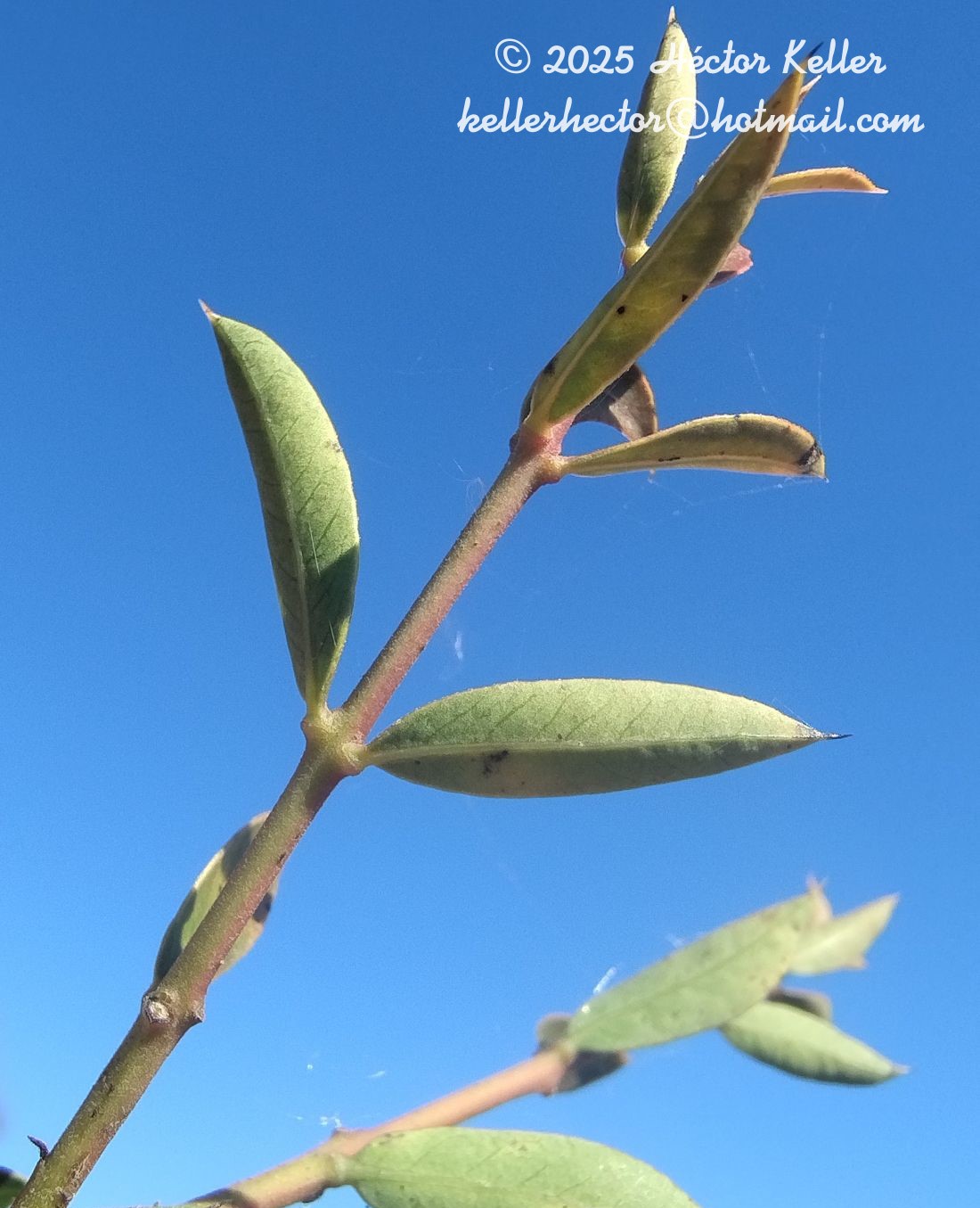 Árbol hasta de 10(-20) m de alto; corteza en general lisa, delgada. Hojas en verticilos 3-meros, raramente opuestas; pecíolo de 1-2 mm de largo; lámina elíptica a angostamente obovada, de 2-4,5 × 0,8-1,3 cm, subcoriácea, con 9-12 pares de venas secundarias claramente visibles, formando ángulos de 45º respecto de la vena media; margen apenas engrosado; ápice agudo a obtuso, terminando en una espina de 1-2 mm de largo, débil, poco punzante; base cuneada a redondeada. Inflorescencias en general paucifloras, laterales, de menor longitud que las hojas, con pedúnculo corto, en general glabro; brácteas ovadas, diminutas, caducas; pedicelos de 1-5 mm de largo. Flores con cáliz con lóbulos ovados, de 1-1,5 cm de largo; corola blanca o rosada, fragante; tubo cilíndrico de 3-5 mm de largo, interiormente pubescente por debajo de los estambres; lóbulos patentes, angostamente oblongos a lanceolados, de 3-5 mm de largo, glabros; estambres insertos en la mitad superior del tubo corolino; anteras ca. 1 mm de largo; ovario globoso de 1 mm de largo; estilo corto; cabeza estilar de 0,5 mm de largo. Folículos de contorno orbicular, obovado u oblongo, delgados, de 3-7 × 2,5-4 cm × 5-6 mm de espesor, de superficie brillante, color castaño, subleñosos; base del folículo contraída en un pequeño pie ca. 1 cm de largo; pedicelo del folículo no acrescente. Semillas en número menor a 11, en general orbiculares, de 3-4 × 3-5 cm, con ala papirácea concéntrica.