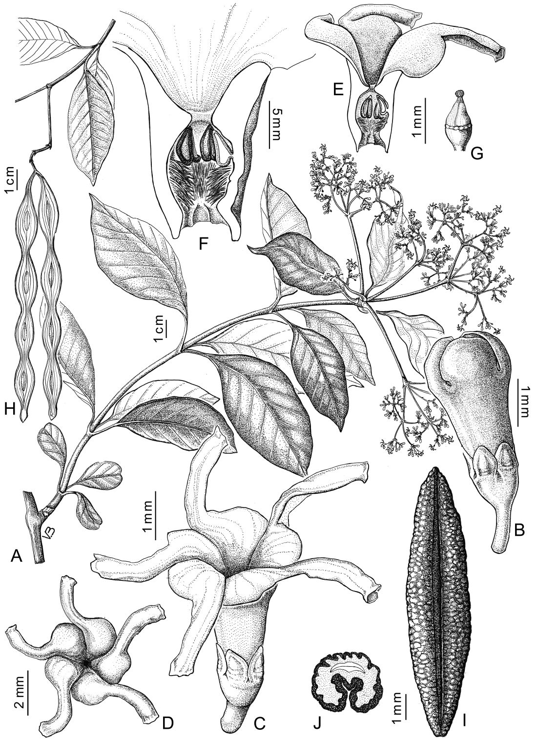 A. Rama florífera. B. Botón floral. C. Flor. D. Corola, vista superior. E. Corte longitudinal de flor. F. Corte longitudinal de flor, detalle para mostrar estambres. G. Ovario, estilo y cabeza estilar. H. Rama con frutos. I. Semilla. J. Corte transversal de semilla.