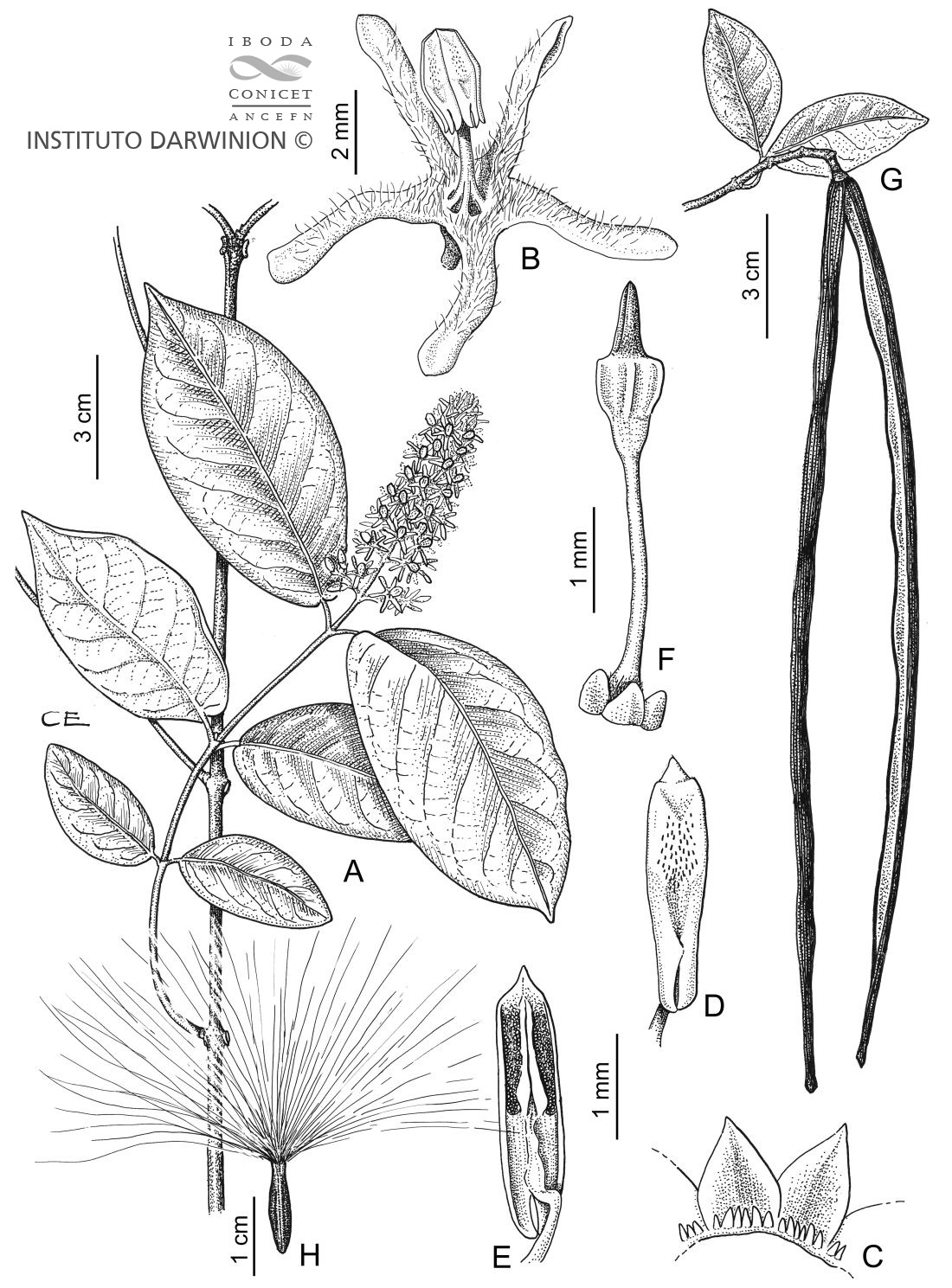 A. Rama florífera. B. Flor. C. Cáliz desplegado, vista ventral. D-E. Estambre, vistas dorsal y ventral, respectivamente. F. Nectarios, estilo y cabeza estilar. G. Fruto.