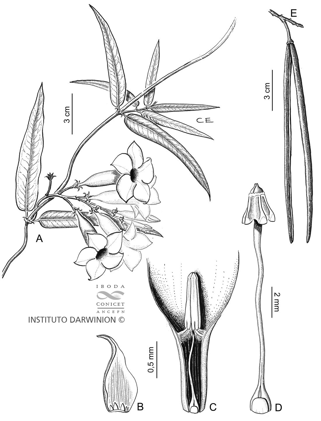 Planta trepadora de tallos volubles, glabros, con apéndices nodales triangulares, comprimidos, de hasta 6 mm long., formando un anillo dentado muy conspicuo alrededor del tallo a la madurez. Hojas opuestas con pecíolo de 0,2-0,9 cm long. y lámina angostamente oblonga a lanceolada, a veces lineal u ovado-oblonga, de 7-12 (17) x 0,3-3 (4,5) cm, glabra, con apéndices glandulares (a veces poco visibles) en la base del nervio medio en el haz; ápice agudo y base redondeada, excepcionalmente levemente cordada. Inflorescencias en racimos laterales de 10-25 cm long., portando 5-20 flores rosadas de cerca de 7 cm long.; brácteas lanceoladas menores de 0,3 cm long., tempranamente caducas; pedicelos de 0,8-2 cm long. Cáliz de lóbulos ovados de aprox. 0,7 cm long., con los ápices acuminados y reflejos, y con una hilera casi continua de apéndices glandulares en sus bases, internamente. Corola hipocraterimorfa con la base contraída en un tubo de 0,8-1,2 cm long., glabro; garganta cilíndrica de 2,7-5 cm long., con el interior glabro excepto a la altura de la inserción de los estambres; lóbulos asimétricos, oblicuamente obovados, de 0,8-2 cm long. Anteras con el ápice agudo y la base profundamente auriculada, de 0,6-0,8 cm long. Ovario ovoide de aprox. 1,5 mm long.; nectarios 2, anchamente oblongos, comprimidos; estilo de cerca de 1 cm long.; cabeza estigmática de 2,5 mm long. Folículos geminados, angostamente cilíndricos, divergentes, de cerca de 15 cm long. y 0,4 cm diám. Semilla de contorno oblongo, comprimida, de 1 cm long., con penacho de pelos de 3 cm long.