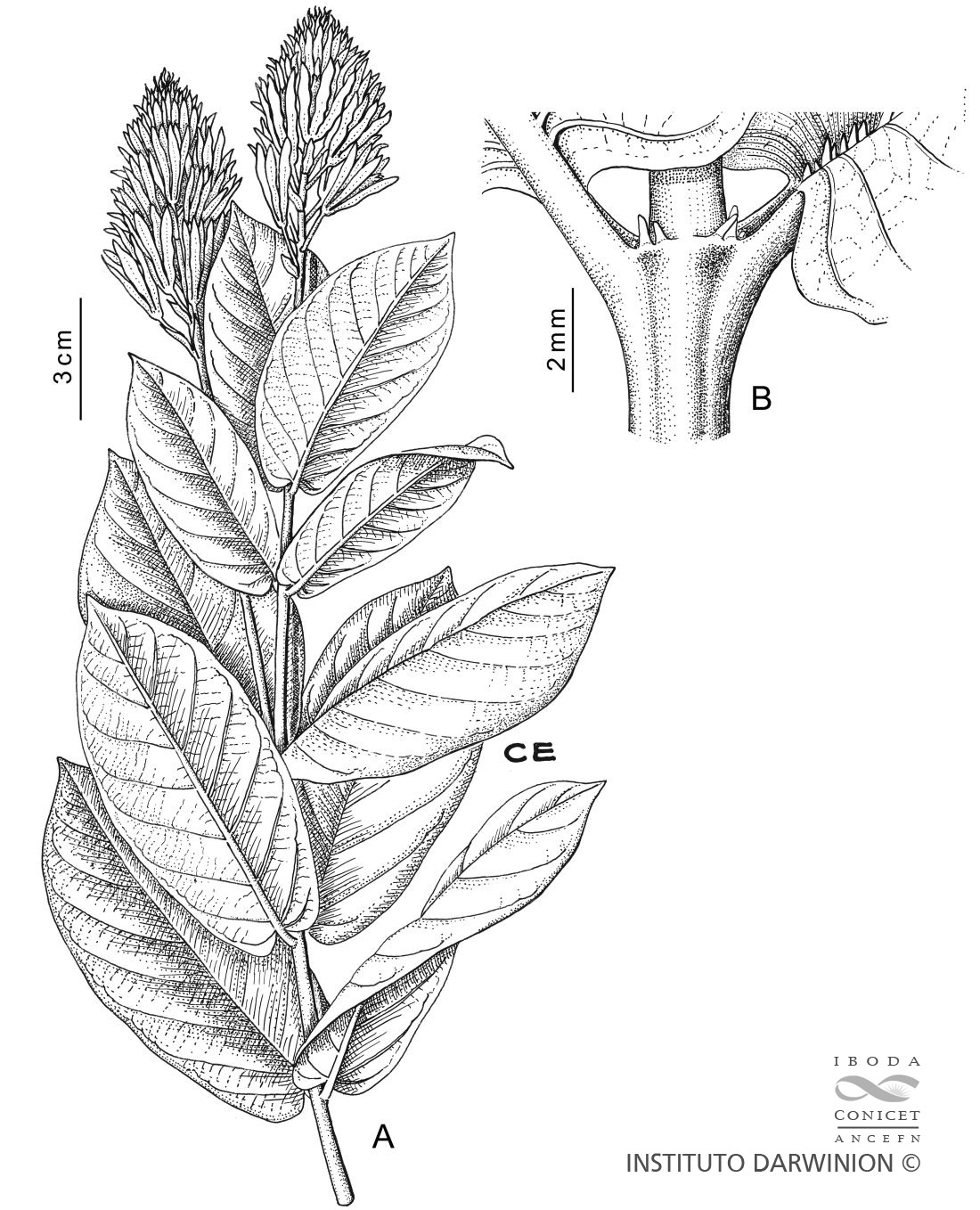 A. Rama florífera. B. Nudo con glándulas interpeciolares y glándulas foliares sobre la vena media.