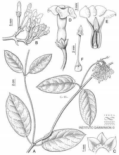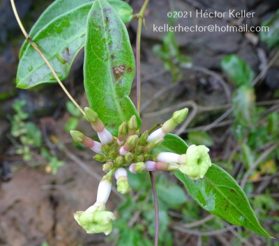 Planta trepadora de tallos volubles, glabros; apéndices nodales inconspicuos. Hojas con pecíolo de 0,5-1,5(-2) cm de largo; lámina elíptica a oblonga o angostamente ovada, de 5-11(-19) × 2-6(-8) cm, membranácea a cartácea, glabra (a veces pubérula en la cara adaxial), con menos de 12 pares de venas secundarias; ápice obtuso o agudo, abrupta y brevemente acuminado (a veces retuso) y base redondeada a muy levemente cordada. Inflorescencias de 3-6,5 cm de largo; pedúnculo de 0,5-4(-9) cm de largo; eje dividido di- o tricotómicamente; brácteas triangular-ovadas de 0,1-0,2 cm de largo; pedicelos de 0,5-1 cm de largo. Flores ca. 1,5 cm de largo, blanco verdosas, con la garganta manchada de lila o morado; cáliz de lóbulos ovados de 0,1-0,2 cm de largo, escariosos en el margen; corola hipocraterimorfa, con la base apenas contraída en un tubo de 0,5-1 cm de largo; garganta angostamente cilíndrica, ca. 0,5-0,8 cm de largo; lóbulos patentes, asimétricos, oblicuamente obovados, de 0,5-1,5 × 0,4-1 cm; anteras angostamente oblongas, de 0,4 cm de largo; ovario angostamente ovoide de 0,2 cm de largo, nectarios de la mitad de su altura; estilo de 0,5-0,7 cm de largo y cabeza estilar de 2 mm de largo. Folículos geminados, subparalelos, angostamente cilíndricos, levemente curvos, de 14-35 × 0,4 cm. Semillas de 0,8-1,2 cm de largo, con penacho de pelos de 1,5-2,5 cm de largo.