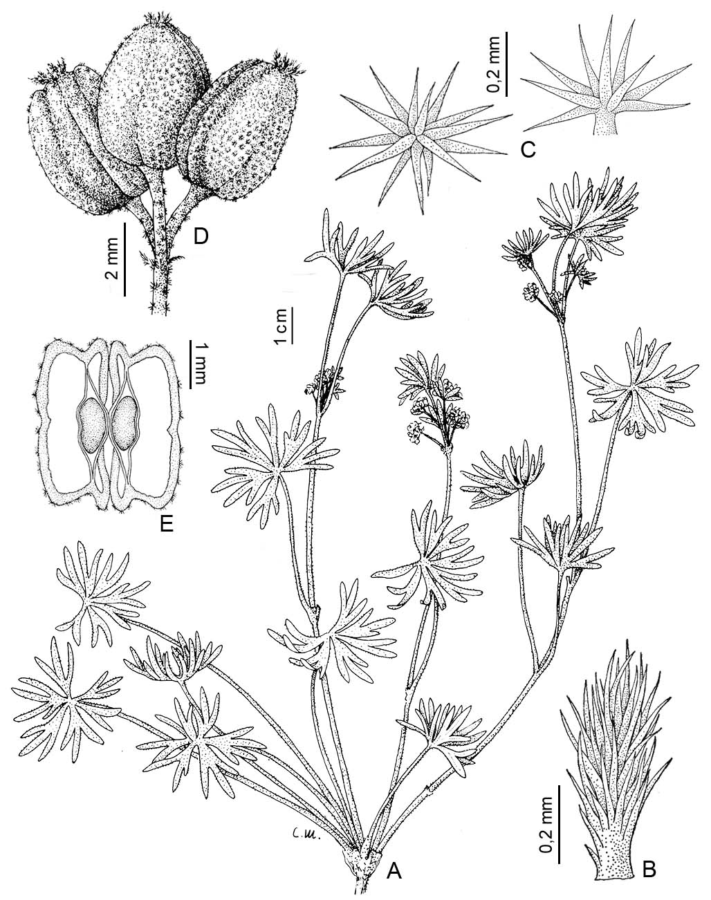 A. Planta. B. Pelo del ápice de hoja. C. Pelos de lámina foliar. D. Umbela fructífera. E. Fruto, corte transversal.