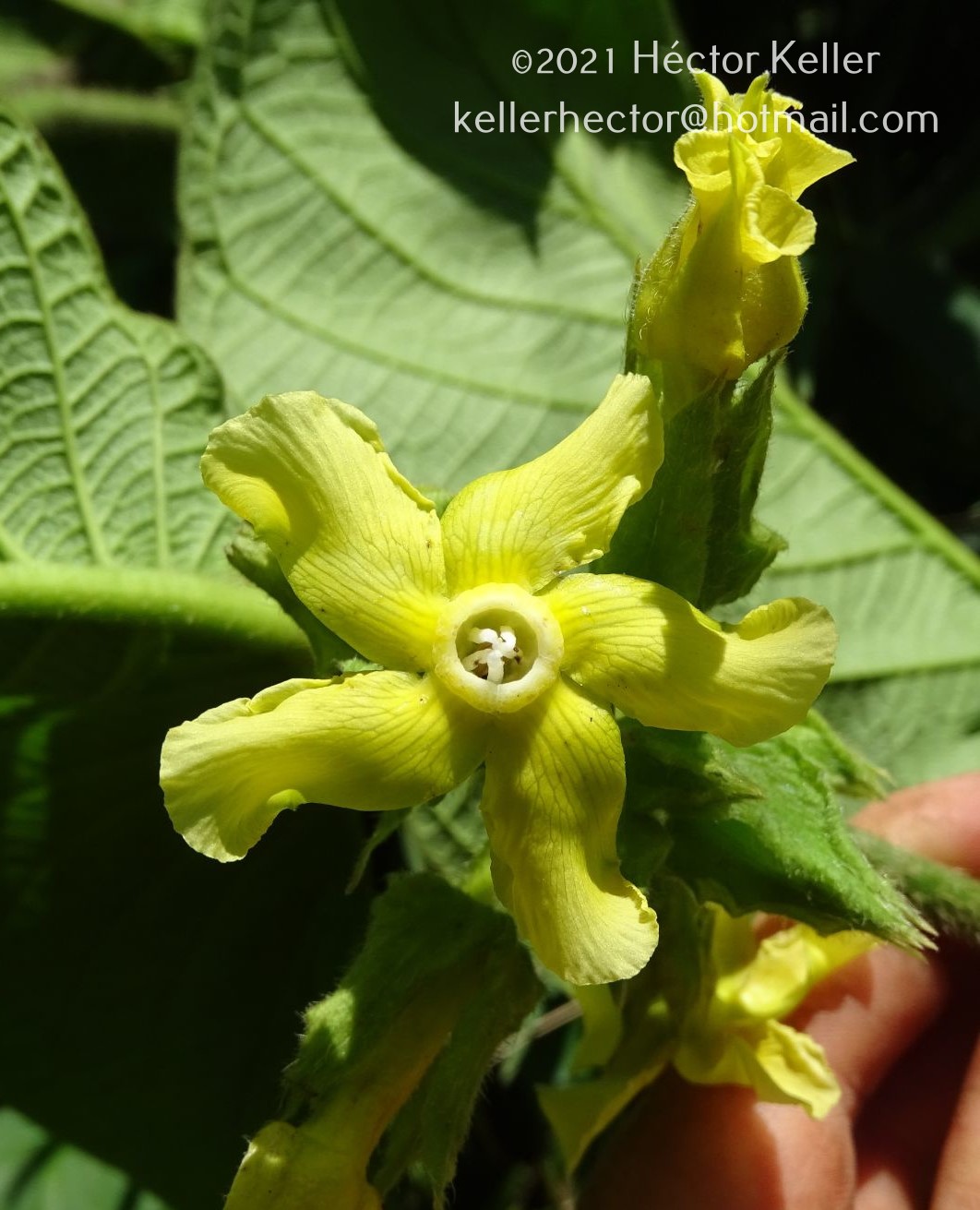 Planta trepadora de tallos robustos, volubles, ferrugíneo-hirsutos, glabrescentes. Hojas con pecíolo de 0,5-1 cm long.; lámina anchamente elíptica a ovada, de 9-17 x 6-13 cm, firmemente membranácea, ferrugíneo-híspida a glabra en el haz y ferrugíneo-hirsuta en el envés, con el ápice agudo y acuminado y la base redondeada a levemente truncada. Inflorescencias umbeliformes; pedúnculo de hasta 5 cm long., ferrugíneo-pubescente; brácteas ovadas a ovado-lanceoladas, de 0,7-1,4 cm long., foliáceas; pedicelos de 0,3-1 cm long. Flores de cerca de 3 cm long. Cáliz de lóbulos ovados a oblongolanceolados, de 1,2-2 cm long., foliáceos, ferrugíneo-pubescentes; apéndices glandulares comprimidos, de contorno trapezoidal. Corola hipocraterimorfa con tubo cilíndrico de 1,6-2 cm long.; apéndices epiestaminales de 0,25-0,4 cm long.; fauces con anillo calloso marcado; lóbulos asimétricos, oblicuamente obovados, de 1,2-1,5 cm long. Anteras sagitadas de 0,5-0,7 cm long., alojadas en el cuarto superior del tubo corolino, más o menos pubescentes dorsalmente. Ovario ovoide de 0,15 cm long.; nectarios anchamente oblongos, comprimidos, de mayor altura. Cabeza estigmática de 0,1-0,15 cm long. Folículos separados, muy divergentes, napiformes, de 6-12 cm long. y hasta 2,5 cm diám., densamente hirsuto-pubescentes a escabrosos, con pubescencia ferrugínea u ocrácea. Semillas de cerca de 1 cm long., con penacho de pelos de cerca de 4 cm long.