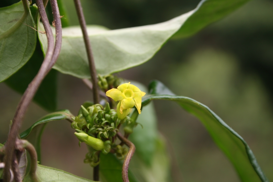 Planta trepadora de tallos volubles, delgados, pubérulos. Hojas con pecíolo de 0,5-1 cm long.; lámina angostamente elíptica a ovada, a veces obovado-angosta, de 5-13 x 2-5 cm, cartácea, glabra en el haz y muy cortamente adpreso-pubérula en el envés, con ápice agudo y apiculado y base obtusa o redondeada. Inflorescencias corimbiformes; pedúnculo de 0,3-0,8 cm long.; brácteas triangular-lanceoladas, diminutas; pedicelos de 0,4-1 cm long. Flores de cerca de 1,5 cm long., amarillo-verdosas. Cáliz de lóbulos oblongo-lanceolados, erectos, de 0,4-0,6 x 1 mm, foliáceos, exteriormente pubérulos; apéndices glandulares comprimidos, de contorno deltoide, lacerados. Corola hipocraterimorfa con tubo cilíndrico de 1-1,5 cm long.; apéndices epiestaminales ausentes; fauces con anillo calloso poco marcado; lóbulos patentes, asimétricos, oblicuamente obovados, de 0,5 cm long. y 0,4 cm lat. aprox. Anteras sagitadas de 0,5 cm long., alojadas en la mitad del tubo corolino, con caudículas basales angostas. Ovario ovoide 0,1 cm long.; nectarios anchamente oblongos, comprimidos, de menor altura. Folículos paralelos, unidos hasta la madurez, muy estrechamente cilíndricos, levemente torulosos, de 25-30 cm long., pubérulos. Semillas de contorno oblongo, de cerca de 0,8 cm long., con penacho de pelos blancos de cerca de 3 cm long.