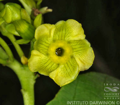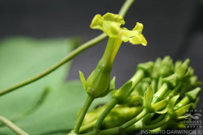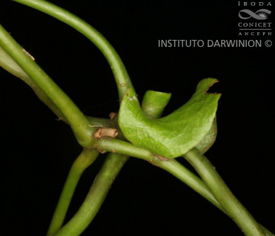 Planta trepadora de tallos volubles, delgados, glabros. Hojas con pecíolo de 0,5-3 cm de largo; lámina elíptica a ovada, de 3-11 × 2,5-6(-9) cm, membranácea, glabra, con ápice agudo y acuminado y base cuneada, obtusa o levemente cordada. Inflorescencias racemiformes; pedúnculo de 2-7 cm de largo; brácteas triangulares, diminutas; pedicelos de 0,5-1 cm de largo. Flores ca. 1,3 cm de largo, amarillo-verdosas; cáliz con lóbulos ovados a anchamente oblongos, de 0,3-0,5 × 0,15-0,25 cm, extendidos, semierectos, foliáceos; apéndices glandulares comprimidos, de contorno trapezoidal, lacerados; corola hipocraterimorfa con tubo cilindro-cónico, de 1-1,3 cm de largo; apéndices epiestaminales de menos de 1 mm de largo; fauces con anillo calloso marcado; lóbulos asimétricos, oblicuamente obovados, de 4-6 × 4 mm; anteras sagitadas, de 5 mm de largo, totalmente inclusas, alojadas en el tercio medio del tubo corolino, glabras, con caudículas basales subuladas, agudas; ovario ovoide de 1,5 mm de largo; nectarios anchamente oblongos, comprimidos, de la mitad de su altura; estilo de 5 mm de largo; cabeza estilar de 1 mm de largo. Folículos estrechamente cilíndricos, de 15-25 cm de largo, paralelos, unidos hasta la madurez, levemente estriados, glabros. Semillas de contorno oblongo, inconspicuamente rostradas, de 5-8 mm de largo, con penacho de pelos blancos de 2-3 cm de largo.