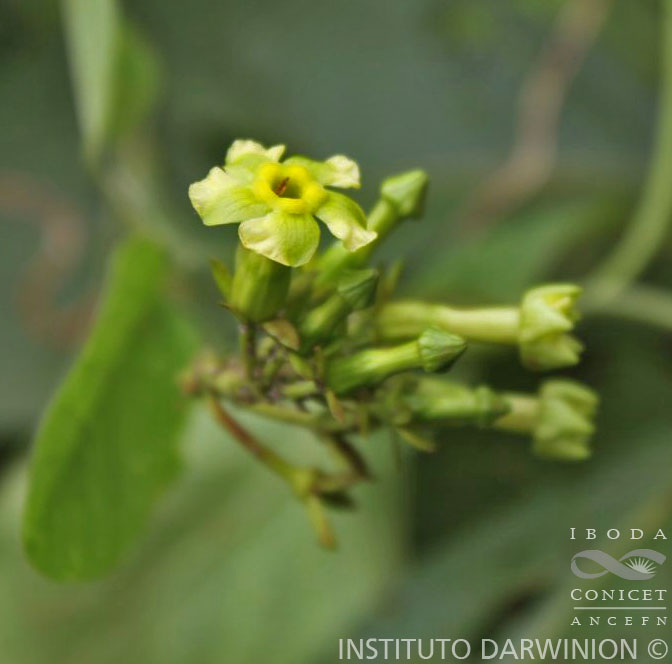 Planta trepadora de tallos volubles, delgados, glabros. Hojas con pecíolo de 0,5-3 cm de largo; lámina elíptica a ovada, de 3-11 × 2,5-6(-9) cm, membranácea, glabra, con ápice agudo y acuminado y base cuneada, obtusa o levemente cordada. Inflorescencias racemiformes; pedúnculo de 2-7 cm de largo; brácteas triangulares, diminutas; pedicelos de 0,5-1 cm de largo. Flores ca. 1,3 cm de largo, amarillo-verdosas; cáliz con lóbulos ovados a anchamente oblongos, de 0,3-0,5 × 0,15-0,25 cm, extendidos, semierectos, foliáceos; apéndices glandulares comprimidos, de contorno trapezoidal, lacerados; corola hipocraterimorfa con tubo cilindro-cónico, de 1-1,3 cm de largo; apéndices epiestaminales de menos de 1 mm de largo; fauces con anillo calloso marcado; lóbulos asimétricos, oblicuamente obovados, de 4-6 × 4 mm; anteras sagitadas, de 5 mm de largo, totalmente inclusas, alojadas en el tercio medio del tubo corolino, glabras, con caudículas basales subuladas, agudas; ovario ovoide de 1,5 mm de largo; nectarios anchamente oblongos, comprimidos, de la mitad de su altura; estilo de 5 mm de largo; cabeza estilar de 1 mm de largo. Folículos estrechamente cilíndricos, de 15-25 cm de largo, paralelos, unidos hasta la madurez, levemente estriados, glabros. Semillas de contorno oblongo, inconspicuamente rostradas, de 5-8 mm de largo, con penacho de pelos blancos de 2-3 cm de largo.