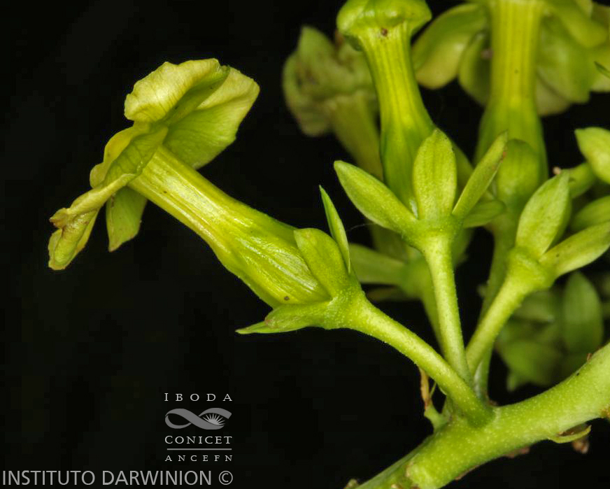 Planta trepadora de tallos volubles, delgados, glabros. Hojas con pecíolo de 0,5-3 cm de largo; lámina elíptica a ovada, de 3-11 × 2,5-6(-9) cm, membranácea, glabra, con ápice agudo y acuminado y base cuneada, obtusa o levemente cordada. Inflorescencias racemiformes; pedúnculo de 2-7 cm de largo; brácteas triangulares, diminutas; pedicelos de 0,5-1 cm de largo. Flores ca. 1,3 cm de largo, amarillo-verdosas; cáliz con lóbulos ovados a anchamente oblongos, de 0,3-0,5 × 0,15-0,25 cm, extendidos, semierectos, foliáceos; apéndices glandulares comprimidos, de contorno trapezoidal, lacerados; corola hipocraterimorfa con tubo cilindro-cónico, de 1-1,3 cm de largo; apéndices epiestaminales de menos de 1 mm de largo; fauces con anillo calloso marcado; lóbulos asimétricos, oblicuamente obovados, de 4-6 × 4 mm; anteras sagitadas, de 5 mm de largo, totalmente inclusas, alojadas en el tercio medio del tubo corolino, glabras, con caudículas basales subuladas, agudas; ovario ovoide de 1,5 mm de largo; nectarios anchamente oblongos, comprimidos, de la mitad de su altura; estilo de 5 mm de largo; cabeza estilar de 1 mm de largo. Folículos estrechamente cilíndricos, de 15-25 cm de largo, paralelos, unidos hasta la madurez, levemente estriados, glabros. Semillas de contorno oblongo, inconspicuamente rostradas, de 5-8 mm de largo, con penacho de pelos blancos de 2-3 cm de largo.