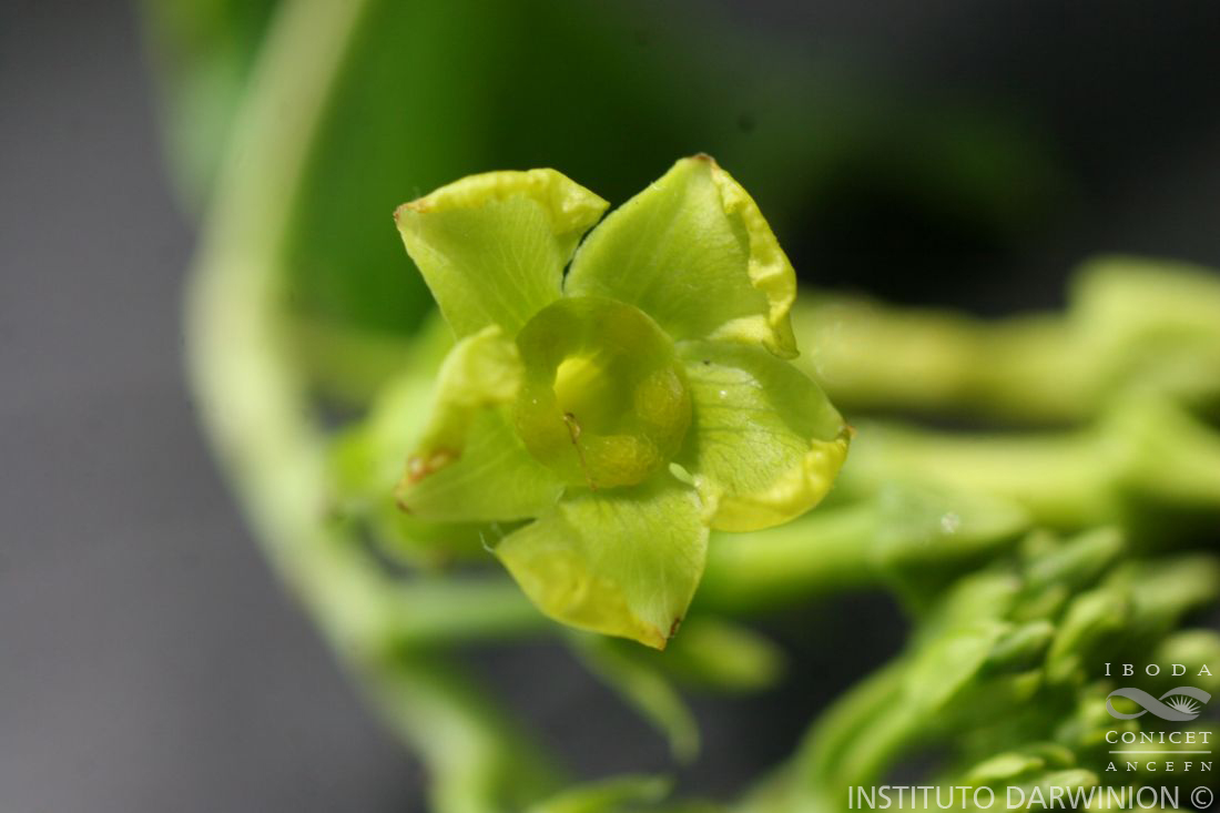 Planta trepadora de tallos volubles, delgados, glabros. Hojas con pecíolo de 0,5-3 cm de largo; lámina elíptica a ovada, de 3-11 × 2,5-6(-9) cm, membranácea, glabra, con ápice agudo y acuminado y base cuneada, obtusa o levemente cordada. Inflorescencias racemiformes; pedúnculo de 2-7 cm de largo; brácteas triangulares, diminutas; pedicelos de 0,5-1 cm de largo. Flores ca. 1,3 cm de largo, amarillo-verdosas; cáliz con lóbulos ovados a anchamente oblongos, de 0,3-0,5 × 0,15-0,25 cm, extendidos, semierectos, foliáceos; apéndices glandulares comprimidos, de contorno trapezoidal, lacerados; corola hipocraterimorfa con tubo cilindro-cónico, de 1-1,3 cm de largo; apéndices epiestaminales de menos de 1 mm de largo; fauces con anillo calloso marcado; lóbulos asimétricos, oblicuamente obovados, de 4-6 × 4 mm; anteras sagitadas, de 5 mm de largo, totalmente inclusas, alojadas en el tercio medio del tubo corolino, glabras, con caudículas basales subuladas, agudas; ovario ovoide de 1,5 mm de largo; nectarios anchamente oblongos, comprimidos, de la mitad de su altura; estilo de 5 mm de largo; cabeza estilar de 1 mm de largo. Folículos estrechamente cilíndricos, de 15-25 cm de largo, paralelos, unidos hasta la madurez, levemente estriados, glabros. Semillas de contorno oblongo, inconspicuamente rostradas, de 5-8 mm de largo, con penacho de pelos blancos de 2-3 cm de largo.