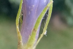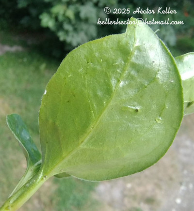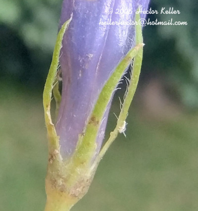 Hierba rastrera, hasta de 40 cm de alto, tallos largamente extendidos, radicantes en los nudos. Hojas pecioladas, ovadas, de base cordada a redondeada o truncada, de 3-10 × 2-7 cm, lustrosas en la cara superior, con la vena media pubescente y ciliadas en el margen. Flores con pedicelo de 2,5-4 cm de largo, llamativas, azules; cáliz con lóbulos linear-lanceolados, de 1-2 cm de largo, ciliados, provistos de 2 glándulas laterales en su tercio inferior; corola hipocraterimorfa con tubo corolino de 1,8-3 cm de largo, anillo calloso en las fauces y limbo patente con lóbulos oblicuamente obovados, truncados u obtusos, ca. 1,5-2,5 cm de largo. Folículos cilíndricos, de 4-5 cm de largo, curvos, agudos, pauciseminados. Semillas de contorno oblongo, de 7-8 mm de largo, verrugosas.