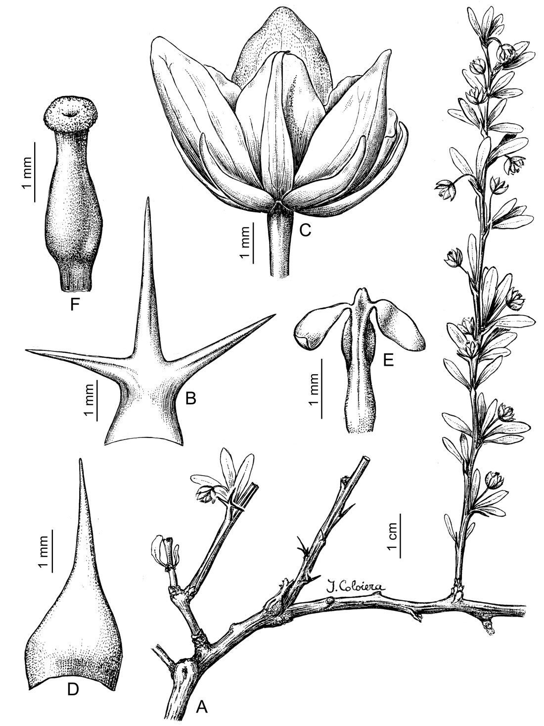 Arbusto de 1-2,5 m de alto; ramas de sección subangulosa, lustrosas, castaño-rojizas, pubérulas, las jóvenes con leve pubescencia hialina y las maduras grises, opacas y agrietadas, siempre surcadas; nudos prominentes y entrenudos de 7,5-15 mm de largo; espinas de 4-8 mm de largo, la espina media de 2-5 mm de largo, las laterales, cuando presentes, de 0,5-3 mm de largo, simples o raramente 3-fi das (en este último caso divaricadas con las ramifi caciones laterales muy reducidas), cuando jóvenes lustrosas, castañas o castaño-rojizas y cuando maduras grises y opacas, delgadas, débiles, ligeramente surcadas en la cara dorsal, de sección casi circular, la base ensanchada, decurrente; braquiblastos ca. 3 mm de largo, escamas oblanceoladas, de 2,5 mm de largo, escariosas, rojizas. Hojas en fascículos de (2-)3(-4); subsésiles o con pecíolo de 1 mm de largo; láminas obovadas, oblanceoladas o elípticas, de 8-22 × 2-8 mm, decurrentes a cuneadas, obtusas o agudas, redondeadas o muy cortamente mucronadas, el margen entero, levemente engrosado, a menudo revoluto; cara adaxial brillante, la abaxial más clara y opaca, membranáceas. Flores solitarias o en fascículos de 3, ca. 6 mm de diámetro; pedicelos de 5-10 mm de largo; sépalos externos 3, ovados, de 3,5 × 0,75 mm, los medios 3, elípticos, de 5,5 × 1,5 mm, y los internos 3, elípticos, de 6 × 2,5 mm, lúteos; pétalos obovados de 4,5 × 2 mm, amarillo-pálidos; glándulas nectaríferas subbasales; estambres 6, de 2,5 mm de largo, conectivo prolongado, agudo, 2-dentado, fi lamento sin apéndices laterales bajo las anteras; gineceo lageniforme de 2,5 mm de largo, ovario subgloboso, ca. 1 mm de largo, estilo y estigma defi nidos ca. 1,5 mm de largo. Fruto una baya de 8 mm de largo, incluyendo estilo y estigma defi nidos, persistentes, de 1,5 mm de largo × 6 mm de diámetro, rojo-vinosa a rojo-parduzca. Semillas 4-6(-12), de 4 × 1,5 mm, pardo oscuras, brillantes.