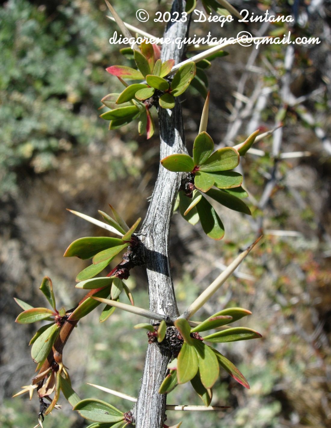 Arbusto de 1-1,50 m de alto; ramas de sección angulosa, glabras, cuando jóvenes rojizas, y cuando maduras grisáceas, ásperas y agrietadas; nudos prominentes y entrenudos de 10-15 mm de largo; espinas 3(-5)-fi das, divaricadas o palmadas, amarillo -claras o castañas, glabras, generalmente brillantes, de tamaño y consistencia variables, la espina media de 15-40 mm de largo, las laterales de 5-30 mm de largo, desde finas y frágiles a gruesas (de 2,5 mm de sección) y muy resistentes, rectas y punzantes, con un surco en la cara dorsal tanto más evidente cuanto mayor es el tamaño de la espina, relación de longitud respecto a las hojas ca. 1:1 a 2:1, coexistiendo todas estas variaciones incluso en un mismo individuo (ocasionalmente con presencia de hojas axilares espiniformes, profundamente lobadas, ca. 32 × 22 mm, con 5 lóbulos mucronados de 12-22 mm de largo); braquiblastos 1-6 por nudo, de 3 mm de largo ; escamas pequeñas, castaño-rojizas. Hojas en fascículos de 4; subsésiles o con pecíolo hasta de 2 mm de largo; láminas obovadas u oblanceoladas, de 15-20 × 3-8 mm, agudas y mucronadas, cuneadas, cara adaxial lustrosa, la abaxial opaca, el margen entero o con 2-4(-6) dientes espinosos, ligeramente revolutas, coriáceas a cartáceas. Flores solitarias de 8 mm de diámetro, amarillo-intensas; pedúnculo ca.10 mm de largo; sépalos externos 3, ovados, de 3 × 1,5 mm, sépalos internos 3, obovados, de 7 × 3 mm; pétalos obovados de 5,5 × 4 mm; glándulas nectaríferas basales, oblongas, prominentes; estambres 6, de 3 mm de largo, conectivo de ápice hendido y con dos apéndices laterales uncinados debajo de las anteras; gineceo elipsoide, de 3,5 × 1,5 mm, ovario subgloboso, estilo cortísimo o nulo, estigma sésil. Fruto una baya globosa, de 8-10 mm de diámetro, negro-azulada. Semillas 4-9, de 4 × 1,5 mm, negras.