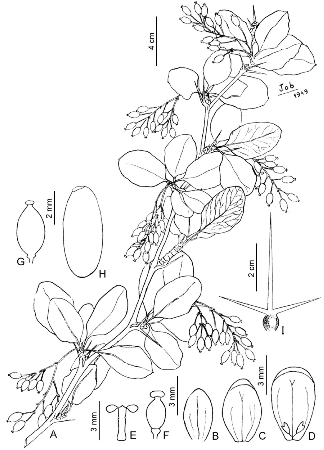 A. Rama fructífera. B. Bráctea. C. Sépalo. D. Pétalo con glándulas basales. E. Estambre. F. Gineceo. G. Fruto. H. Semilla. I. Espina. [Extraído de Revista Mus. La Plata, Secc. Bot. 8(34): 174. 1953, fi g. 4].