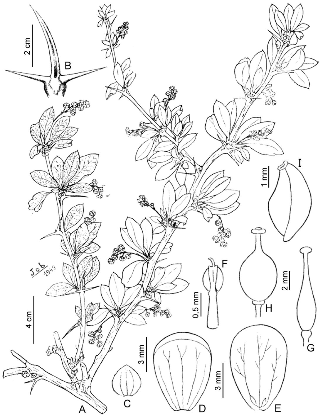 A. Rama florífera. B. Espina. C. Bráctea. D. Sépalo. E. Pétalo con glándulas basales. F. Estambre. G. Gineceo. H. Fruto. I. Semilla. [Extraído de Revista Mus. La Plata, Secc. Bot. 34: 173. 1953, fi g. 3].