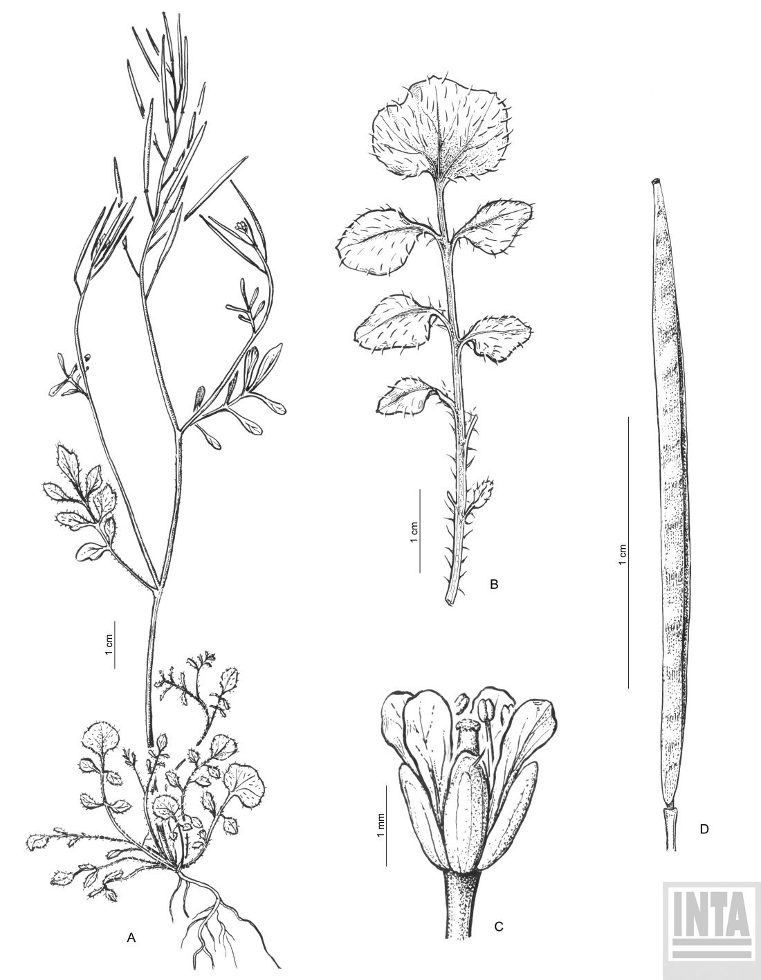 Hierbas anuales, escasamente hirsutas, al menos a lo largo de los pecíolos de las hojas basales, a menudo glabras en la parte superior; rizomas y estolones ausentes. Tallos de (3-)10- 35(-45) cm de alto, erectos, ascendentes o decumbentes, 1 a numerosos desde la base, simples o ramificados, no flexuosos. Hojas basales rosuladas, persistentes durante la antesis, (5-)8-15(-22)- folioladas, de (2-)3,5-15(-17) cm de largo; pecíolos ciliados, de 0,5-5 cm de largo; folíolo terminal reniforme u orbicular, de 0,4-2 × 0,6-3 cm, margen entero, ondulado, dentado o 3-5-lobulado; peciólulos de 2-10 mm de largo; folíolos laterales oblongos, ovados, obovados u orbiculares, más pequeños que el lóbulo terminal, enteros, ondulados, crenados o 3-lobulados; hojas caulinares 1-4(-6), compuestas como las basales, cortamente pecioladas, de (0,5-)1,2-5,5(-7) cm de largo (incluyendo el pecíolo), base del pecíolo no auriculada. Racimos ebracteados; pedicelos fructíferos erectos a ascendentes, de (2-)3-10(-14) mm de largo. Sépalos oblongos, de 1,5-2,5 × 0,3-0,7 mm, el par lateral no sacciforme en la base; pétalos blancos, espatulados, de 2,5- 4,5(-5) × 0,5-1,1 mm, a veces ausentes; estambres 4, rara vez 5 ó 6, par lateral ausente; filamentos de 1,8-3 mm de largo; anteras ovoides, de 0,3-0,5 mm de largo; óvulos 14-40. Frutos lineares, de (0,9-)1,5-2,5(-2,8) cm × (0,8-)1-1,4 mm, a menudo adpresos; valvas glabras, torulosas; estilo de 0,1-0,6(-1) mm de largo. Semillas castaño-claras, oblongoides o subcuadradas, de 0,9- 1,3(-1,5) × 0,6-0,9(-1,1) mm, angostamente marginadas. 2n = 16.