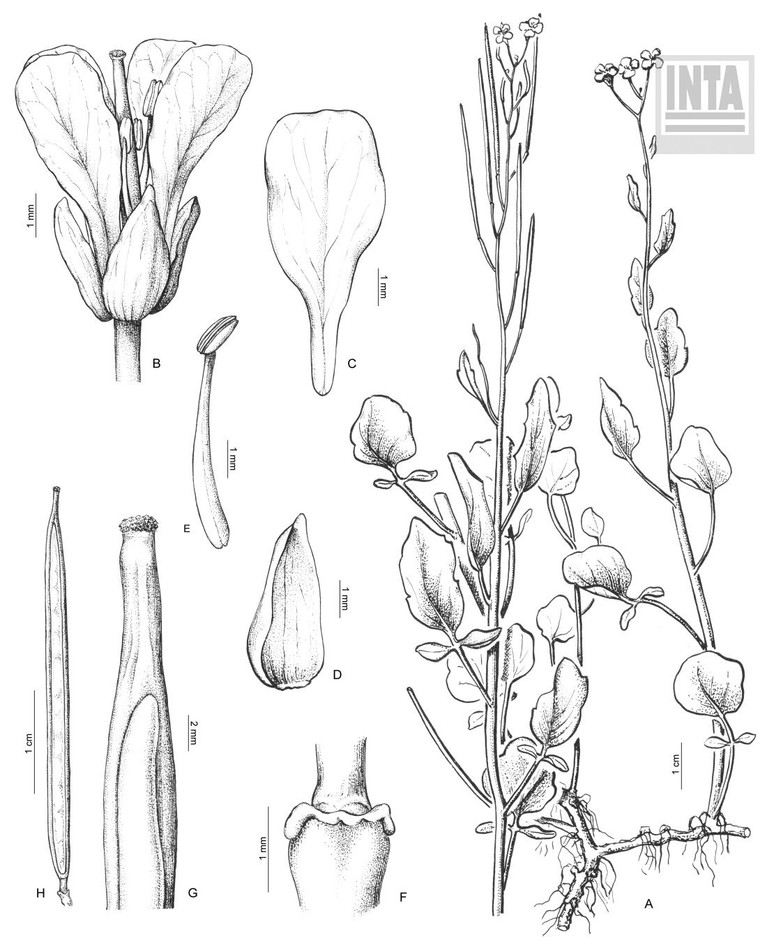 A. Planta, porción basal a la derecha, superior a la izquierda. B. Flor. C. Pétalo. D. Sépalo mediano. E. Estambre. F. Base del gineceo con nectarios. G. Ápice del gineceo. H. Silicua.