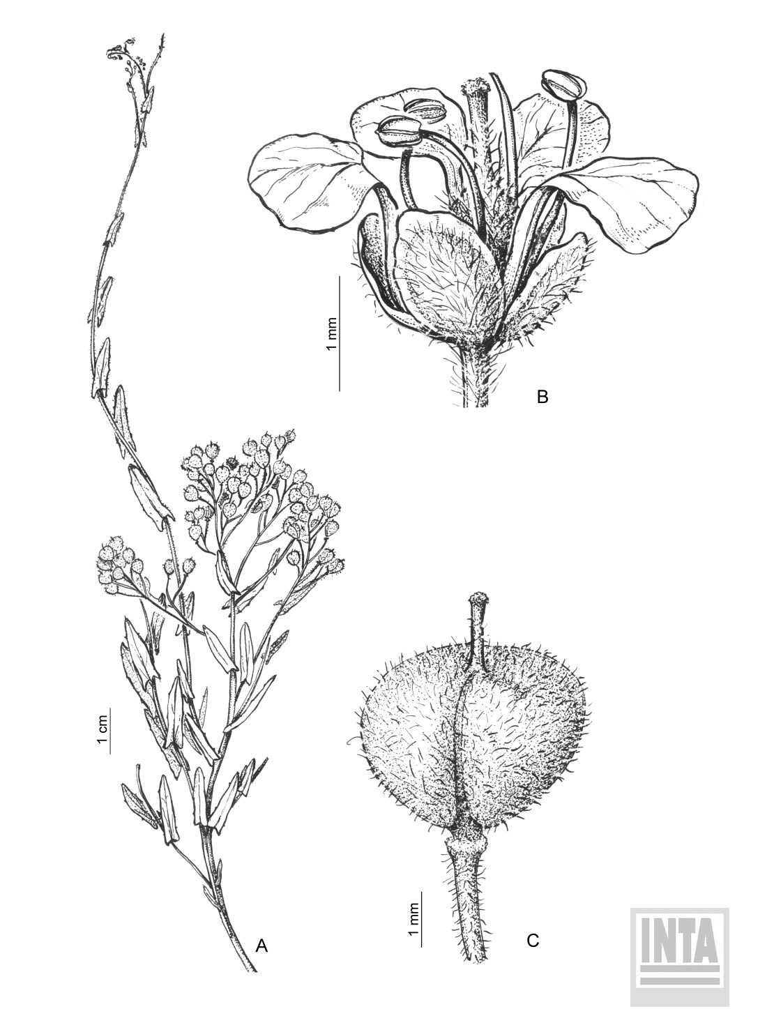 Hierbas perennes, rizomatosas, usualmente con pubescencia densa o puberulentas, con tricomas a menudo curvados. Tallos de (10-)15-35(-50) cm de alto, erectos, ramificados en la parte superior. Hojas basales y caulinares inferiores con pecíolos de 0,5-1,5 cm de largo; láminas oblanceoladas u obovadas, de (1-)2- 6(-7) × 0,3-2 cm, pubescentes, base atenuada, ápice obtuso o agudo, margen sinuado-lobulado o dentado; hojas caulinares superiores sésiles; láminas oblongas o lanceoladas, de 1-5(-8) × (0,3-)0,5-1,5(-3) cm, pubescentes, base sagitada, margen dentado o subentero. Racimos ligeramente alargados durante la fructificación; pedicelos fructíferos de 3-6(-10) mm de largo, delgados, puberulentos, divaricados. Sépalos oblongos, de 1,5-2 mm de largo, pubescentes, margen blanco; pétalos blancos, obovados, de (2,5-)3-4 × 1-5 mm, base unguiculada, ápice redondeado; estambres 6; filamentos de 2-2,5 mm de largo; anteras ovoides de 0,4-0,5 mm de largo; glándulas nectaríferas confluentes. Frutos indehiscentes, globosos a subglobosos, de (2-)3-4(-5) mm de diámetro, redondeados en el ápice y base o levemente cordados basalmente, sin escotadura apical; valvas semiglobosas, no carinadas, infladas, a menudo densamente puberulentas, rara vez subglabras, enervias u ligeramente nervadas; estilo de 0,7-1,5 mm de largo, glabro o escasamente puberulento en su porción proximal. Semillas castañas a castaño- oscuras, ovoides, de 1,5-2 × 1-1,5 mm; cotiledones incumbentes. 2n = 16.