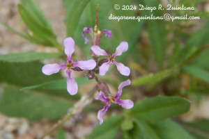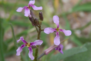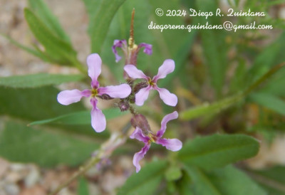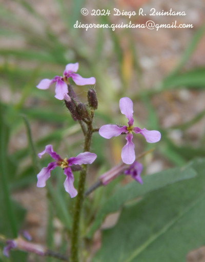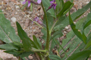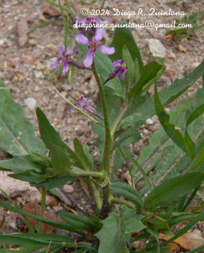 Hierbas anuales, con glándulas multicelulares grandes, éstas a veces mezcladas con tricomas simples. Tallos de (5-)10-40(-56) cm de alto, erectos o ascendentes, ramificados en la parte superior. Hojas basales no rosuladas, marchitándose a menudo durante la floración; pecíolos de (0,5-)1-2(-4) cm de largo; láminas oblanceoladas u oblongas, de (1,5-)2,5-8(-13) × (0,4-)0,8-2(-3) cm, glandulares, cuneada o atenuada hacia la base, ápice agudo, margen sinuado-dentado a dentado; hojas caulinares similares a las basales, progresivamente reducidas en tamaño hacia el ápice de la planta, las superiores a menudo enteras y subsésiles. Racimos plurifloros, alargados durante la fructificación; pedicelos fructíferos robustos, de (2-)3-5 mm de largo, divaricados, glandulares. Sépalos purpúreos, violáceos, lineares, de (3-)4-5(-6) × 0,5-0,7 mm; pétalos purpúreos, lavanda o rara vez blancos, oblanceolados, de 8-10(-12) × 12 mm, obtusos en el ápice, uña de 6-7 mm de largo; filamentos de 4-6(-7) mm de largo; anteras estrechamente oblongoides, ca. 1,5 mm de largo; óvulos 16-24. Frutos cilíndricos, de (1,4-)1,8-2,5(-3) cm × 1,5-2 mm, ligeramente curvados hacia arriba, corchosos, subtorulosos, glandulares o rara vez no glandulares; estilo de (0,6-)1-1,8(-2,2) cm de largo. Semillas castañas, oblongoides, de 1-1,4 × 0,8-1 mm. 2n = 14.