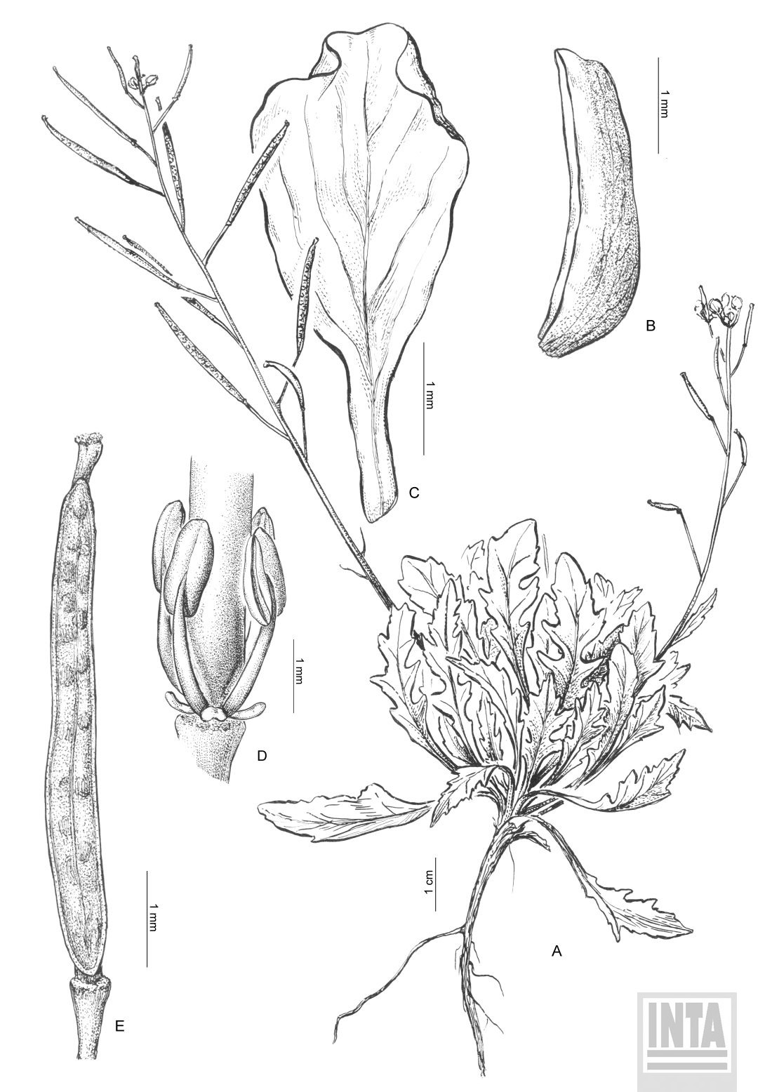Hierbas anuales o perennes de corta vida, con raíz pivotante. Tallos de (5-)20-50(-60) cm de alto, ascendentes a suberectos, escapíferos, rara vez no escapíferos, moderadamente pubescentes, con predominio de tricomas retrorsos hasta la base de la inflorescencia. Hojas basales rosuladas, pecioladas, glabrescentes a escasamente pubescentes en margen y nervaduras; láminas elípticas a obovadas, de 2-9 × 1-3,5 cm, algo liradas, margen sinuado a pinnatífido,con 2-4(-6) lóbulos laterales a cada lado; hojas caulinares ausentes o pocas, con pecíolo corto o sésiles, enteras o dentadas. Pedicelos fructíferos de (3- )8-20(-37) mm de largo. Sépalos oblongos, de 3-5,5 mm de largo, con unos pocos tricomas en la cara externa o glabros; pétalos amarillos, obovados, de 5-8(-10) × 3-5 mm; filamentos de 3,5-6 mm de largo; anteras de 1,5-2 mm de largo; óvulos 20-36. Frutos de (1,5-)2-4 cm × 1,5-2,5 mm, erecto-patentes; ginóforo muy breve, hasta de 0,5 mm de largo; segmento terminal rostrado, de (1-)1,5- 3 mm de largo, sin semillas. Semillas ovoides a elipsoides, de 0,9- 1,3 × 0,6-0,9 mm. 2n = 42.