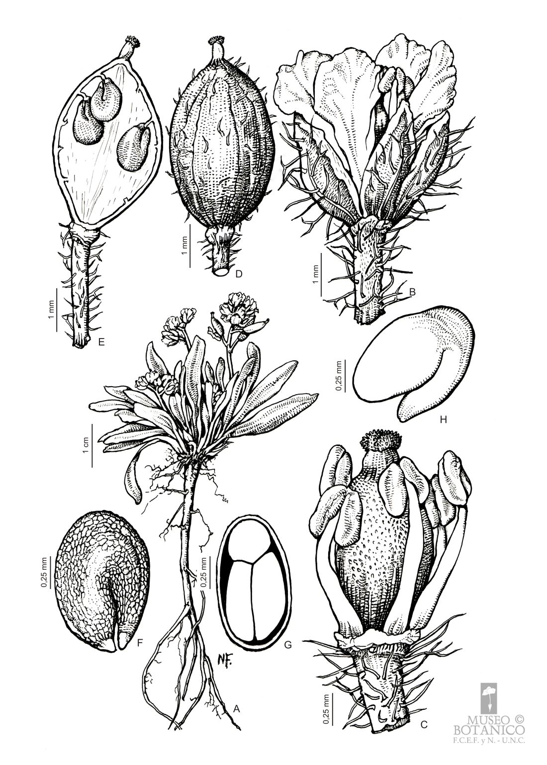 A. Planta. B. Flor. C. Flor desprovista de perianto. D. Silícula. E. Silícula, corte longitudinal mostrando el replum y la inserción de las semillas. F. Semilla. G. Semilla, transcorte. H. Embrión.