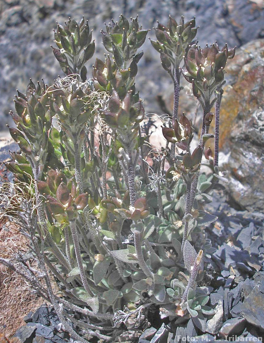 Hierbas perennes, cespitosas, de (2-)6-36(-63) cm de alto; cáudice simple o muy ramificado, usualmente cubierto por las hojas o sólo por las bases peciolares, las ramas rematan en rosetas. Tallos erectos a subdecumbentes, simples o ramificados, con tricomas estrellados subsésiles a cortamente pedunculados, a menudo mezclados con tricomas simples o ahorquillados hacia la base. Hojas basales rosuladas; láminas oblanceoladas a espatuladas, rara vez obovadas, de (0,3-)1-3(-4) cm × (1-)2-6(-14) mm, áoice agudo a obtuso, margen ciliado y entero, ambas superficies cubiertas escasa a densamente por tricomas estrellados, sésiles a pedunculados, rara vez mezclados con tricomas simples; pecíolos cortos, con la porción basal persistente; hojas caulinares 2-5(-8), sésiles, ampliamente ovadas a casi oblongas u obovadas, de (0,4-)0,8-2(-3) cm × (1-)2-6(-12) mm, enteras o dentadas. Racimos corimbiformes, alargados o no durante la fructificación, ebracteados o sólo con las flores basales bracteadas; pedicelos fructíferos divaricados a ascendentes o suberectos, rectos o rara vez curvados, de (1-)2-9(-15) mm de largo. Sépalos ovados a oblongos, caducos, rara vez persistentes, erectos, de (1,8-)2-3(-4) mm de largo, , base no sacciforme, ápice redondeadopubescentes, con tricomas estrellados, ahorquillados, rara vez simples; pétalos blancos, espatulados, rara vez obovados, de 3-4,5(-5) ×1-2 mm, reducidos hacia la base en forma de uña, ápice emarginado u obtuso; filamentos blancos, erectos, de (1,5-)2,2-3 mm de largo; anteras ovoides, de 0,3-0,5 mm de largo; óvulos 20-34. Frutos comprimidos, amplia a estrechamente oblongoides, a veces lanceolados u ovoides, no retorcidos, de (3-)5-9(-13) × (1,5-)2-3(-3,5) mm; valvas por lo general densamente pubescentes, con tricomas estrellados, sésiles o cortamente pedunculados, muy rara vez glabrescentes; estilo de 0,2-0,8(-1) mm de largo; estigma entero o ligeramente 2- lobulado. Semillas 2-seriadas, comprimidas, ovoides a generalmente oblongoides, de (0,9-)1-1,1(-1,2) × 0,6-0,7 mm, no aladas, castaño claras a oscuras.