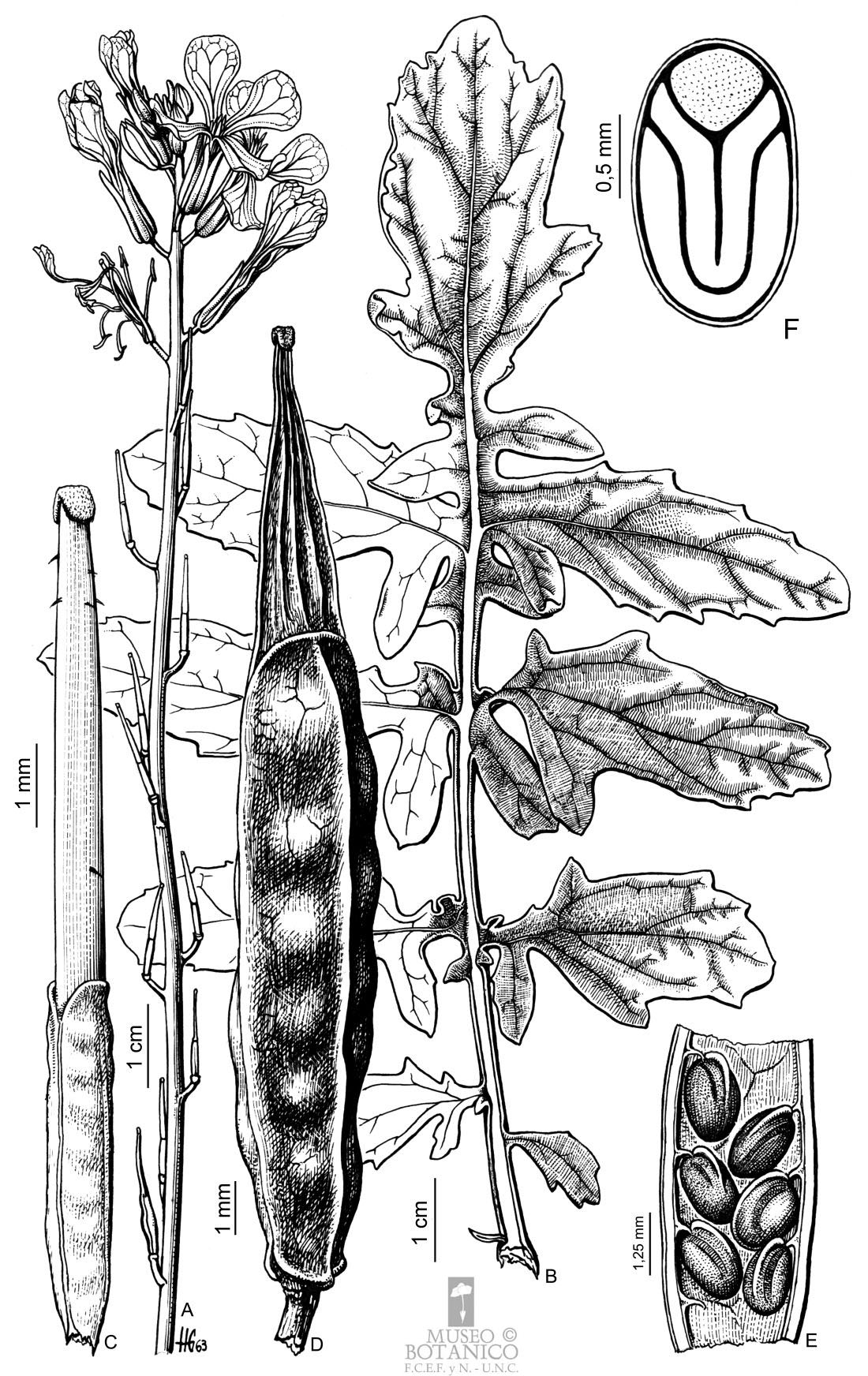 Tallos de (10-)20-80(-100) cm de alto, generalmente ramificados desde la base, glabros o retrorsamente hirsutos o híspidos. Hojas basales a menudo marchitas durante la fructificación; pecíolos de (1-)2-5(-7) cm de largo; láminas ampliamente oblanceoladas, de (2-)4-15(-20) × (1-)2-4(-6) cm, simples a pinnatisectas; lóbulos laterales 3-9 a cada lado, margen entero o dentado; hojas caulinares superiores subsésiles, lobuladas o no. Pedicelos fructíferos erectos a ascendentes, de 2-8(-10) mm de largo, robustos, subadpresos al raquis. Sépalos oblongos, de (6-)7-10(-12) × 1,5-2,2 mm, glabros o con un mechón de tricomas subapicales, el par exterior cuculado o no; pétalos por lo general obovados, de (1,2-)1,5-2(-2,6) cm × (4-)5-7(-9) mm; filamentos medianos de (8-)10-13(-15) mm de largo; anteras de 2-3 mm de largo. Frutos lineares u oblongoides, de (1,1-)1,5-3,5(-4) cm × (2,5-)3-5 mm, glabros o retrorsamente híspidos o hirsutos; valvas de (0,7-)1-2,5(-3,2) mm de largo, con un nervio central prominente; segmento terminal ensiforme, aplanado, de (4-)5-10(-11) mm de largo, 5-nervio, de igual largo o ligeramente más corto que las valvas. Semillas castaño pálidas o grisáceas, subglobosas a ovoides, de 1,6-2,5 mm de largo. 2n = 22.