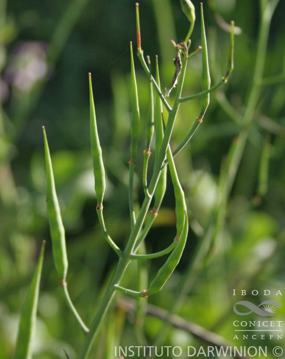 Tallos de (10-)20-80(-100) cm de alto, generalmente ramificados desde la base, glabros o retrorsamente hirsutos o híspidos. Hojas basales a menudo marchitas durante la fructificación; pecíolos de (1-)2-5(-7) cm de largo; láminas ampliamente oblanceoladas, de (2-)4-15(-20) × (1-)2-4(-6) cm, simples a pinnatisectas; lóbulos laterales 3-9 a cada lado, margen entero o dentado; hojas caulinares superiores subsésiles, lobuladas o no. Pedicelos fructíferos erectos a ascendentes, de 2-8(-10) mm de largo, robustos, subadpresos al raquis. Sépalos oblongos, de (6-)7-10(-12) × 1,5-2,2 mm, glabros o con un mechón de tricomas subapicales, el par exterior cuculado o no; pétalos por lo general obovados, de (1,2-)1,5-2(-2,6) cm × (4-)5-7(-9) mm; filamentos medianos de (8-)10-13(-15) mm de largo; anteras de 2-3 mm de largo. Frutos lineares u oblongoides, de (1,1-)1,5-3,5(-4) cm × (2,5-)3-5 mm, glabros o retrorsamente híspidos o hirsutos; valvas de (0,7-)1-2,5(-3,2) mm de largo, con un nervio central prominente; segmento terminal ensiforme, aplanado, de (4-)5-10(-11) mm de largo, 5-nervio, de igual largo o ligeramente más corto que las valvas. Semillas castaño pálidas o grisáceas, subglobosas a ovoides, de 1,6-2,5 mm de largo. 2n = 22.