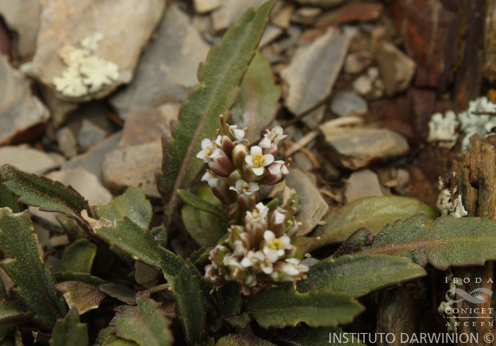 Hierbas perennes, con cáudice no ramificado, pubescentes, con tricomas adpresos, fuertemente crispados, de 0,1-0,5 mm de largo. Tallos de 1,5-6 cm de largo, escasos, glabros o esparcidamente pubescentes, a menudo más cortos que las hojas basales. Hojas basales largamente pecioladas; pecíolos persistentes, de 0,5-4 cm de largo, pajizos, glabros y marcadamente alados en la porción proximal, pubescentes y no alados en la porción distal; láminas oblongas a oblongo-oblanceoladas, de 0,5-2,3 × 0,4-1 cm, glabrescentes en la parte inferior, a menudo densamente villosas en la superior, con tricomas subadpresos y crispados, base cuneada a obtusa, ápice obtuso, margen serrado- crenado o rara vez algo pinnatífido y no dividido; nervio central prominente en la mitad proximal; hojas caulinares similares a las basales pero gradualmente reducidas en tamaño hacia el ápice, no auriculadas. Racimos apenas alargados durante la fructificación; pedicelos fructíferos divaricados, usualmente rectos, densamente villosos, de 4-7 mm de largo. Sépalos oblongos a ligeramente obovados, papiráceos, persistentes, extendidos, margen membranáceo, enteros a ondulado, glabrescentes, de 1,8-2,5 mm de largo; pétalos espatulados, blancos, redondeados en el ápice, de 2-3 × 0,9-1,2 mm; estambres 4, medianos; filamentos blancos, de 1,6-2,2 mm de largo, dilatados considerablemente en la base; anteras oblongoides de 0,5-0,6 mm de largo. Frutos dehiscentes, romboidales, de 3-4,5 × 2,5-4 mm; valvas glabras, delgadas, conspicuamente nervadas; septo membranáceo, perforado en el ápice; escotadura apical de 0,2-0,4 mm de largo; estilo de 0,6-0,8 mm de largo, exerto de la escotadura apical. Semillas ovoides, aplanadas, castaño oscuras, no aladas, de 1,7-2,4 × 1-1,6 mm; cotiledones incumbentes.