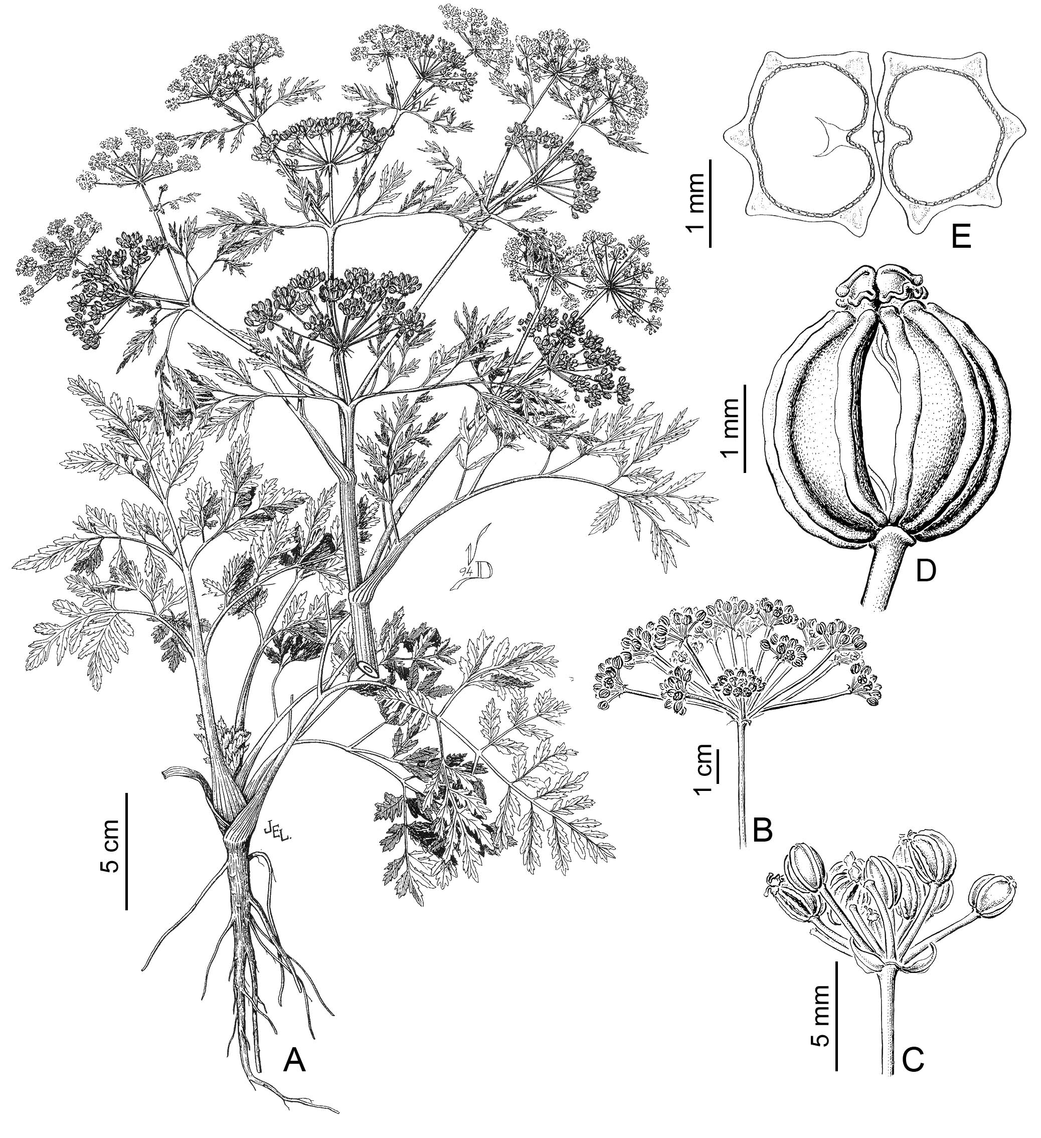 A. Planta. B. Umbela. C. Umbélula. D-E. Fruto, vista lateral y corte transversal respectivamente.