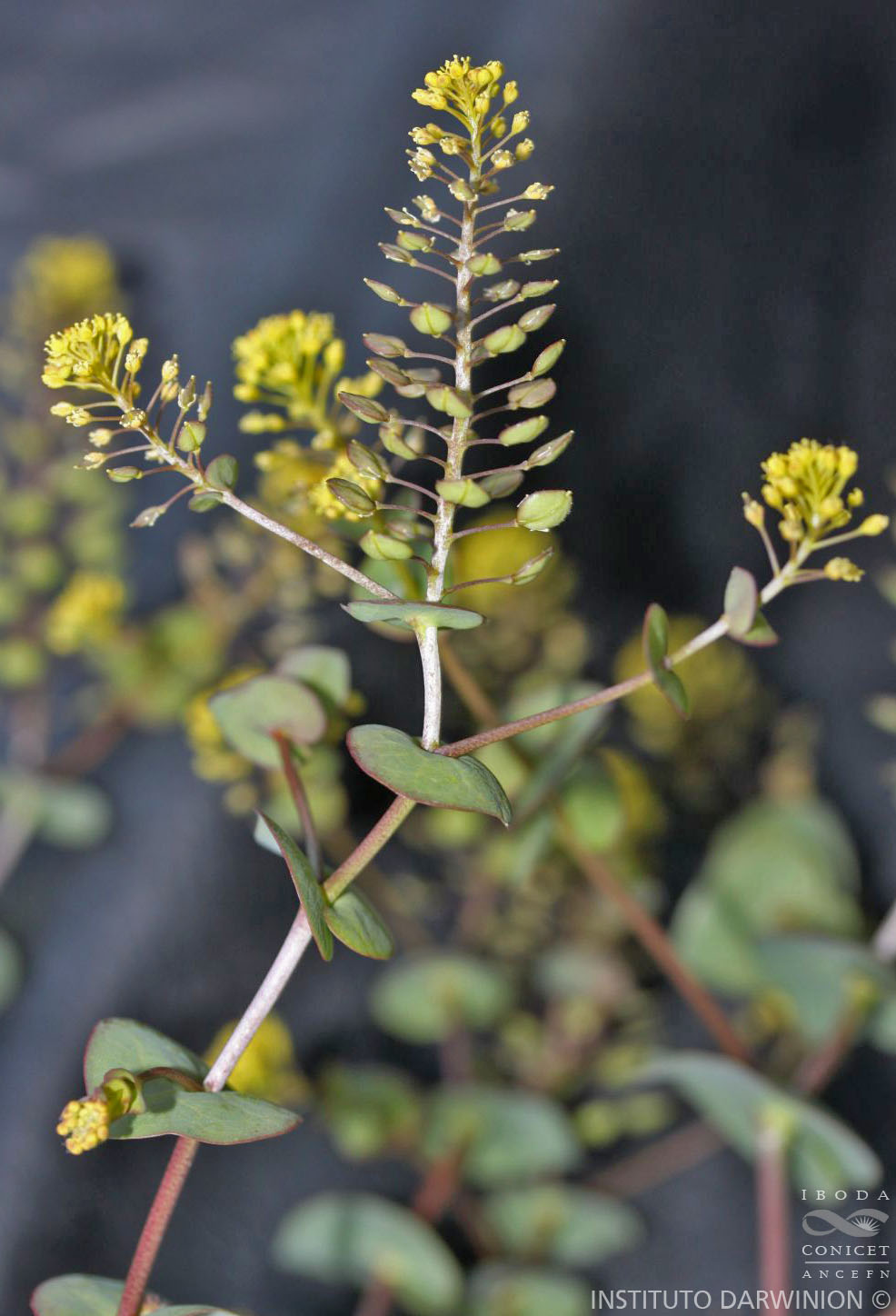 Hierbas anuales o bienales, de (7-)15-40(-65) cm de alto, glabras o con escasa pubescencia en la parte inferior, a menudo levemente glaucas. Tallos erectos, simples en la base, ramificados en la parte superior. Hojas marcadamente dimorfas. Hojas basales y caulinares inferiores con pecíolos de (0,5-)1-2(-4) cm de largo; láminas 2-3-pinnatífidas o 2-3-pinnatisectas, de (1-)3-8(-15) cm de largo, lóbulos terminales lineares o angostamente oblongos; hojas caulinares superiores sésiles; láminas ampliamente ovadas, cordadas o suborbiculares, de (0,5-)1-3(-4) × (0,5-)1- 2,5(-3,5) cm, profundamente cordado-amplexicaules, ápice agudo, margen entero. Racimos alargados durante la fructificación; pedicelos fructíferos divaricados, de 3-5(-7) mm de largo, delgados, rectos, glabros, teretes. Sépalos verde-amarillentos, oblongos, de 0,8-1(-1,3) mm de largo; pétalos amarillos, estrechamente espatulados, de 1-1,5(-1,9) × 0,2-0,5 mm, base atenuada a unguiculada con uña ca. 0,5 mm de largo; estambres 6; filamentos de 0,6-0,9 mm de largo; anteras de 0,1-0,2 mm de largo. Frutos dehiscentes, romboidales u orbiculares, de 3-4,5(-4,8) × 3-4 mm, estrechamente alados en la porción distal, alas de 0,2-0,4 mm de largo; escotadura apical hasta de 0,3 mm de largo; estilo de 0,1- 0,3 mm de largo, igual o más corto que la escotadura apical. Semillas castaño-oscuras, ovoides, de 1,6-2(-2,3) × 1,2-1,4 mm, estrechamente aladas; cotiledones incumbentes. 2n = 16.