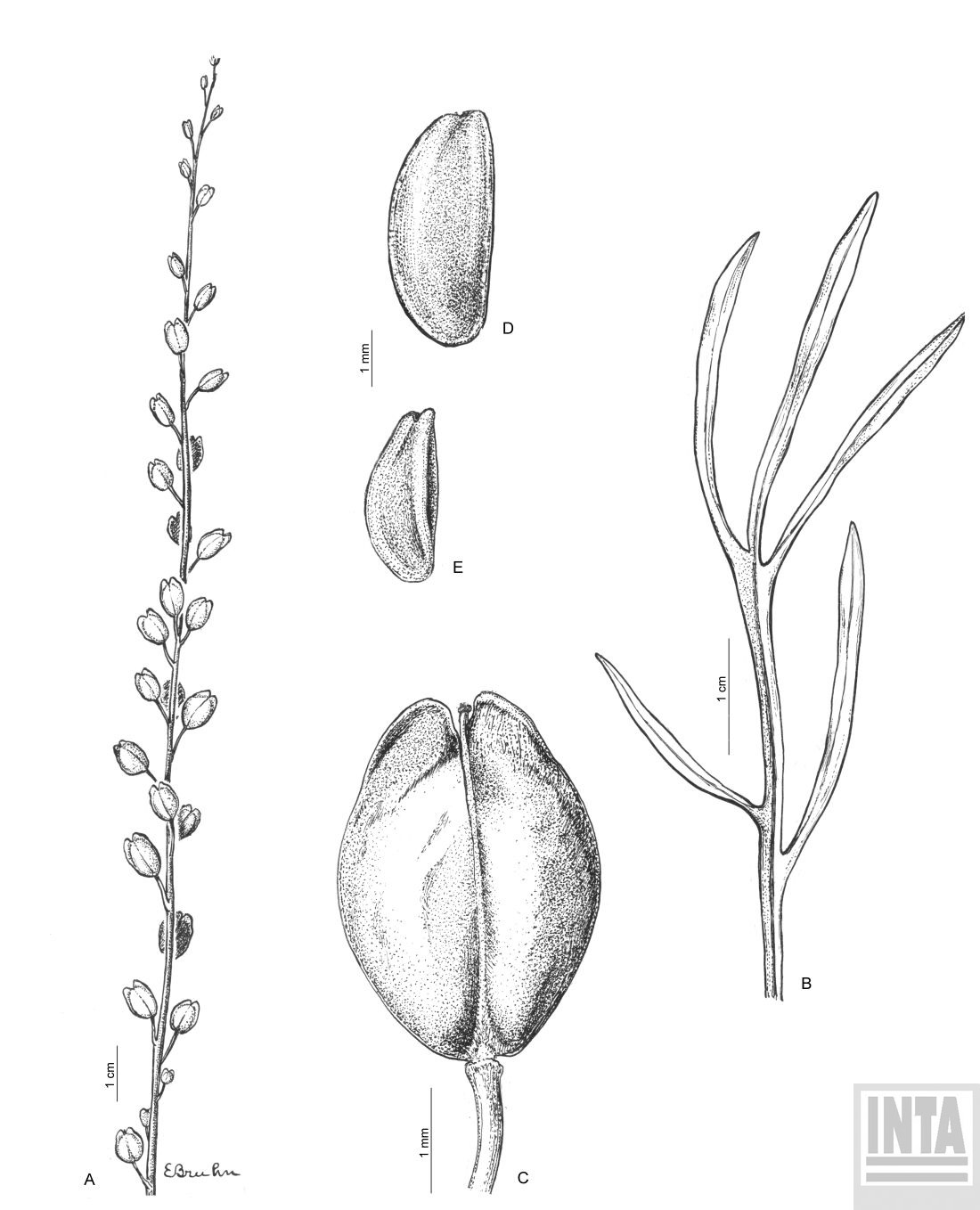 A. Porción de rama fructífera. B. Hoja. C. Silícula. D y E. Semilla.
