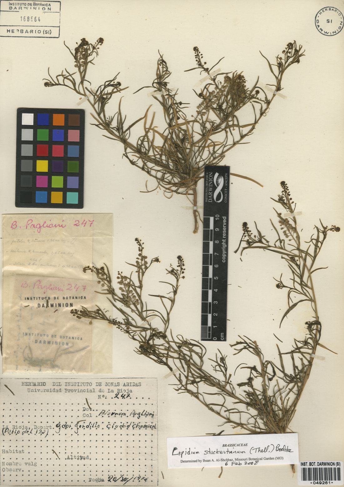 Hierbas anuales, densamente puberulentas, con tricomas rectos de 0,05-0,15 mm de largo. Tallos erectos, de (5-)10-40 cm de alto, puberulentos, ramificados en la parte superior y a veces en la base. Hojas basales largamente pecioladas, de 2-10 cm de largo, pinnatisectas, base extendida y ciliada, con tricomas de 0,3-0,5 mm de largo; lóbulos laterales 3-7, lineares a lanceolados, enteros, rara vez divididos, base expandida y ciliada; hojas caulinares medias y superiores lineares, enteras, rara vez pinnatisectas, no auriculadas, de 1-4,5 cm × 0,5-1 mm. Racimos densos durante la fructificación; raquis puberulento, con tricomas rectos; pedicelos fructíferos ligeramente comprimidos, con márgenes estrechamente alados, divaricados a ascendentes, rectos, rara vez levemente recurvados, de 2-6 mm de largo, abaxialmente glabros, adaxialmente puberulentos. Sépalos ovados, de 0,5-0,7 mm de largo, caducos, pilosos en la superficie exterior, margen blanco; pétalos blancos, de 0,1-0,4 mm de largo; estambres 2, medianos; filamentos de 0,4-0,6 mm de largo; anteras de 0,15- 0,25 mm de largo. Frutos dehiscentes, orbiculares u orbicularobovoides, de 2-2,5 mm de largo y ancho similar, glabros, estrechamente alados en la parte apical, ápice emarginado; escotadura apical de 0,15-0,25 mm de largo; estilo muy breve, hasta de 0,05 mm de largo. Semillas castañas, ovoides, de 1-1,5 × 0,6-0,9 mm, marginadas; cotiledones incumbentes.