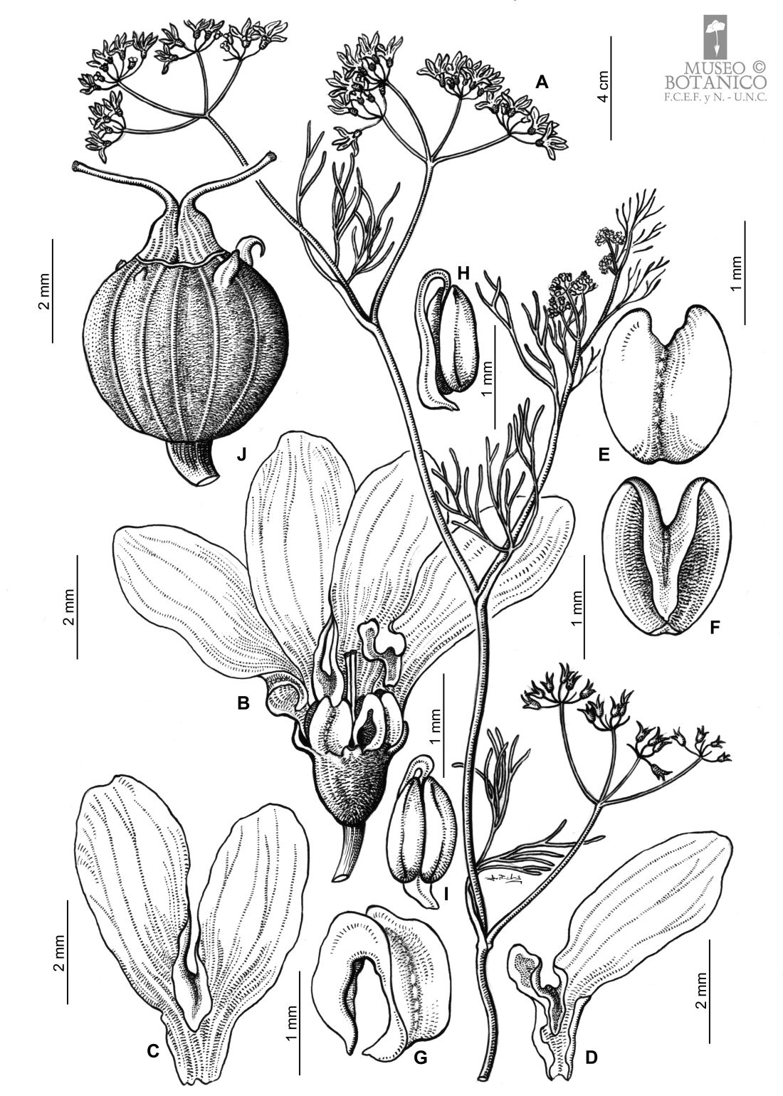 A. Planta. B. Flor. C-D. Pétalo mayor en vistas ventral y lateral respect. E-G. Pétalos menores en vistas dorsal, ventral y lateral respect. H-I. Estambres en vistas lateral y ventral respect. J. Fruto