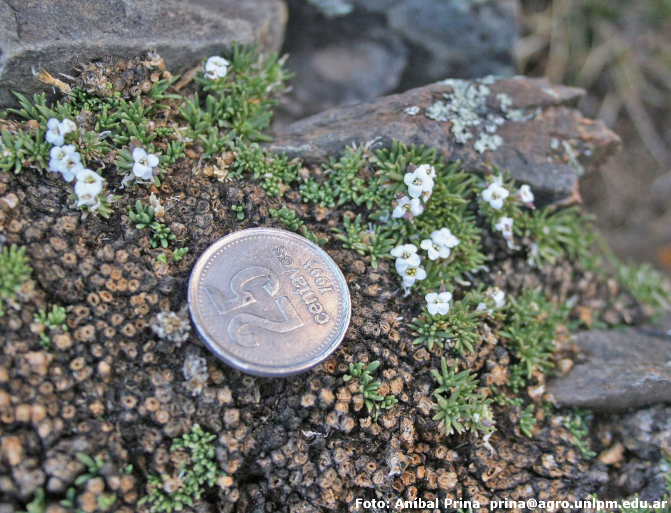 Tallos con ramas terminales rematando en rosetas y escapos de 0,5-2 cm de largo. Hojas basales de 5-15 mm de largo, base foliar con aspecto de pecíolo, pajiza, de 2-5 mm de largo; láminas lineares, de 3-12 × 0,5-1 mm, enteras, ápice obtuso a subagudo. Pedicelos fructíferos de 3-7 mm de largo. Sépalos de 1,5-2,2 mm de largo; pétalos de 2-3(-3,5) × 1-1,5 mm, uña de 1-2 mm de largo; filamentos de 1,5-2,5 mm de largo; anteras ca. 0,5 mm de largo. Frutos de 3,5-4,5 × 1,5-2 mm; estilo de 0,2-0,5 mm de largo. Semillas de 1,5-2,2 × 0,8-1,2 mm.