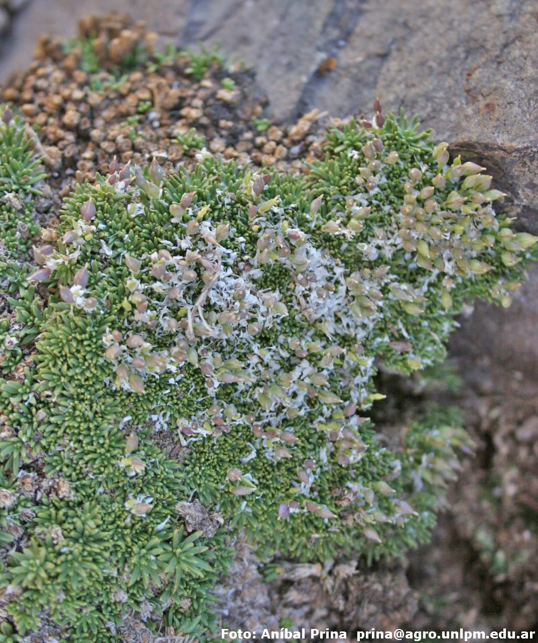 Tallos con ramas terminales rematando en rosetas y escapos de 0,5-2 cm de largo. Hojas basales de 5-15 mm de largo, base foliar con aspecto de pecíolo, pajiza, de 2-5 mm de largo; láminas lineares, de 3-12 × 0,5-1 mm, enteras, ápice obtuso a subagudo. Pedicelos fructíferos de 3-7 mm de largo. Sépalos de 1,5-2,2 mm de largo; pétalos de 2-3(-3,5) × 1-1,5 mm, uña de 1-2 mm de largo; filamentos de 1,5-2,5 mm de largo; anteras ca. 0,5 mm de largo. Frutos de 3,5-4,5 × 1,5-2 mm; estilo de 0,2-0,5 mm de largo. Semillas de 1,5-2,2 × 0,8-1,2 mm.