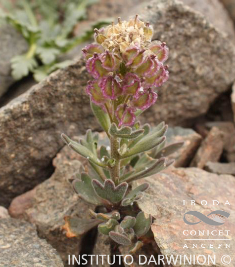 Plantas perennes, con tallos subterráneos leñosos y muy ramificados. Tallos aéreos de (5-)10-20(-32) cm de alto, herbáceos a leñosos, delgados, varios a numerosos ramificándose desde la base, erectos a subdecumbentes, ramificados o no en la parte superior, pubescentes a canescentes con tricomas simples, teretes, rectos y retrorsos o menos frecuentemente extendidos, de 0,4-1(-1,2) mm de largo. Hojas sólo caulinares, no rosuladas, subsésiles o menos frecuentemente cortamente pecioladas; láminas oblanceoladas a cuneadas, raramente obovadas, de (6-)10-20(-35) × 4-10 mm, canescentes, de cuneadas a atenuadas, márgenes enteros, ápice 3-dentado o en ocasiones 3-lobado, raro entero y entonces agudo a redondeado. Racimos terminales, ebracteados o más comúnmente con las flores inferiores bracteadas, corimbosos, densos, elongados en la fructificación, de 2-7(-10) cm largo; raquis densamente pubescente, recto; pedicelos fructíferos ascendentes, divaricados a reflexos, rectos a recurvos, de (5-)7-12(15) mm largo, hirsutos. Sépalos oblongos, de (2,5-)4-5,5(-6.5) × (1,2-)1,5-2(-2,3) mm, pubescentes, erectos, no saccciformes, caducos, con los márgenes escariosos; pétalos blancos a blanco-cremosos, en ocasiones levemente purpúreos, espatulados, de (4-)6-10(-12) × (1,5-)2- 2.5 mm, con uña diferenciada, sin papilas en la base; estambres tetradínamos; anteras angostamente oblongoides, de (0,8-)1,1- 1,6(-2) mm de largo, sagitadas en la base; filamentos libres, erectos, levemente dilatados y sin papilas en la base, de (2-)4-5(-7) mm de largo; glándulas nectaríferas confluentes, rodeando la base de todos los filamentos. Frutos suborbiculares a elipsoides, glabros a hirsutos; valvas 3, 5 (-7)-aladas, con nervios trasversales leve a conspicuamente marcados, de (4-)5-8(-11) × (3-)5-8(-10) mm, emarginadas en el ápice; alas laterales y dorsal similares, de (0,5-)1,1-2,5(-3,5) mm de ancho; ginóforo de 0,5-1,8 mm de largo; estilo de (1-)1,5-3,5(-4,5) mm de largo; estigma subdecurrente. Semillas oblongoides a ovoides, de (2-)2,5-4 × (1,2-)1,8-3 mm, no aladas, aplanadas; cotiledones acumbentes.