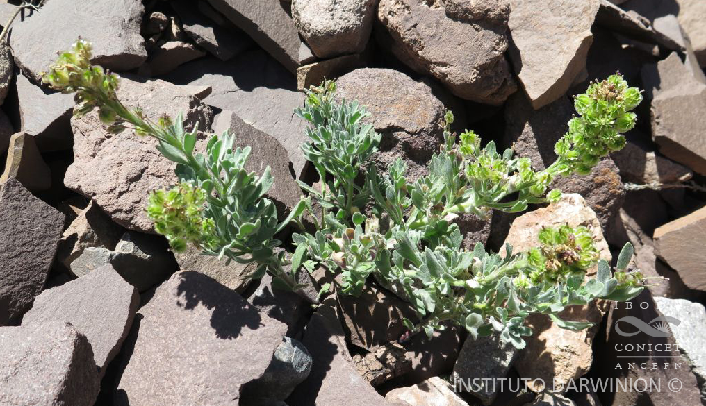 Plantas perennes, con tallos subterráneos leñosos y muy ramificados. Tallos aéreos de (5-)10-20(-32) cm de alto, herbáceos a leñosos, delgados, varios a numerosos ramificándose desde la base, erectos a subdecumbentes, ramificados o no en la parte superior, pubescentes a canescentes con tricomas simples, teretes, rectos y retrorsos o menos frecuentemente extendidos, de 0,4-1(-1,2) mm de largo. Hojas sólo caulinares, no rosuladas, subsésiles o menos frecuentemente cortamente pecioladas; láminas oblanceoladas a cuneadas, raramente obovadas, de (6-)10-20(-35) × 4-10 mm, canescentes, de cuneadas a atenuadas, márgenes enteros, ápice 3-dentado o en ocasiones 3-lobado, raro entero y entonces agudo a redondeado. Racimos terminales, ebracteados o más comúnmente con las flores inferiores bracteadas, corimbosos, densos, elongados en la fructificación, de 2-7(-10) cm largo; raquis densamente pubescente, recto; pedicelos fructíferos ascendentes, divaricados a reflexos, rectos a recurvos, de (5-)7-12(15) mm largo, hirsutos. Sépalos oblongos, de (2,5-)4-5,5(-6.5) × (1,2-)1,5-2(-2,3) mm, pubescentes, erectos, no saccciformes, caducos, con los márgenes escariosos; pétalos blancos a blanco-cremosos, en ocasiones levemente purpúreos, espatulados, de (4-)6-10(-12) × (1,5-)2- 2.5 mm, con uña diferenciada, sin papilas en la base; estambres tetradínamos; anteras angostamente oblongoides, de (0,8-)1,1- 1,6(-2) mm de largo, sagitadas en la base; filamentos libres, erectos, levemente dilatados y sin papilas en la base, de (2-)4-5(-7) mm de largo; glándulas nectaríferas confluentes, rodeando la base de todos los filamentos. Frutos suborbiculares a elipsoides, glabros a hirsutos; valvas 3, 5 (-7)-aladas, con nervios trasversales leve a conspicuamente marcados, de (4-)5-8(-11) × (3-)5-8(-10) mm, emarginadas en el ápice; alas laterales y dorsal similares, de (0,5-)1,1-2,5(-3,5) mm de ancho; ginóforo de 0,5-1,8 mm de largo; estilo de (1-)1,5-3,5(-4,5) mm de largo; estigma subdecurrente. Semillas oblongoides a ovoides, de (2-)2,5-4 × (1,2-)1,8-3 mm, no aladas, aplanadas; cotiledones acumbentes.