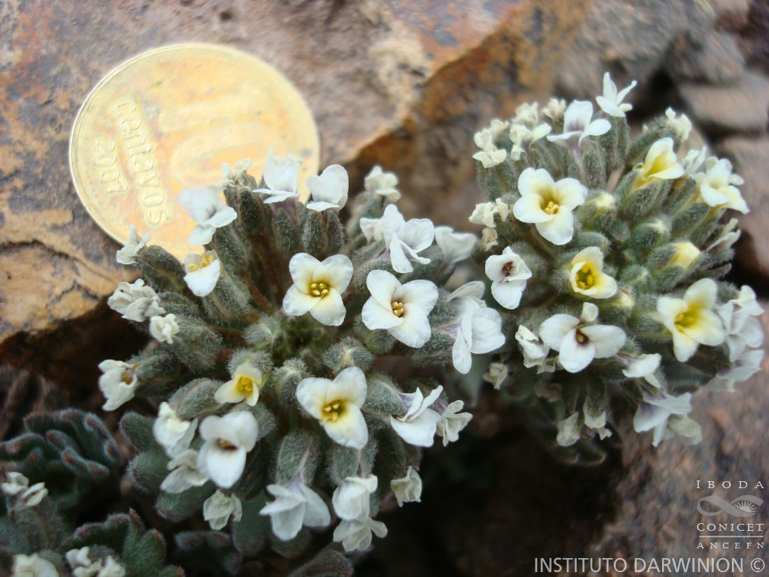 Plantas perennes, con tallos subterráneos leñosos y muy ramificados. Tallos aéreos de (5-)10-20(-32) cm de alto, herbáceos a leñosos, delgados, varios a numerosos ramificándose desde la base, erectos a subdecumbentes, ramificados o no en la parte superior, pubescentes a canescentes con tricomas simples, teretes, rectos y retrorsos o menos frecuentemente extendidos, de 0,4-1(-1,2) mm de largo. Hojas sólo caulinares, no rosuladas, subsésiles o menos frecuentemente cortamente pecioladas; láminas oblanceoladas a cuneadas, raramente obovadas, de (6-)10-20(-35) × 4-10 mm, canescentes, de cuneadas a atenuadas, márgenes enteros, ápice 3-dentado o en ocasiones 3-lobado, raro entero y entonces agudo a redondeado. Racimos terminales, ebracteados o más comúnmente con las flores inferiores bracteadas, corimbosos, densos, elongados en la fructificación, de 2-7(-10) cm largo; raquis densamente pubescente, recto; pedicelos fructíferos ascendentes, divaricados a reflexos, rectos a recurvos, de (5-)7-12(15) mm largo, hirsutos. Sépalos oblongos, de (2,5-)4-5,5(-6.5) × (1,2-)1,5-2(-2,3) mm, pubescentes, erectos, no saccciformes, caducos, con los márgenes escariosos; pétalos blancos a blanco-cremosos, en ocasiones levemente purpúreos, espatulados, de (4-)6-10(-12) × (1,5-)2- 2.5 mm, con uña diferenciada, sin papilas en la base; estambres tetradínamos; anteras angostamente oblongoides, de (0,8-)1,1- 1,6(-2) mm de largo, sagitadas en la base; filamentos libres, erectos, levemente dilatados y sin papilas en la base, de (2-)4-5(-7) mm de largo; glándulas nectaríferas confluentes, rodeando la base de todos los filamentos. Frutos suborbiculares a elipsoides, glabros a hirsutos; valvas 3, 5 (-7)-aladas, con nervios trasversales leve a conspicuamente marcados, de (4-)5-8(-11) × (3-)5-8(-10) mm, emarginadas en el ápice; alas laterales y dorsal similares, de (0,5-)1,1-2,5(-3,5) mm de ancho; ginóforo de 0,5-1,8 mm de largo; estilo de (1-)1,5-3,5(-4,5) mm de largo; estigma subdecurrente. Semillas oblongoides a ovoides, de (2-)2,5-4 × (1,2-)1,8-3 mm, no aladas, aplanadas; cotiledones acumbentes.