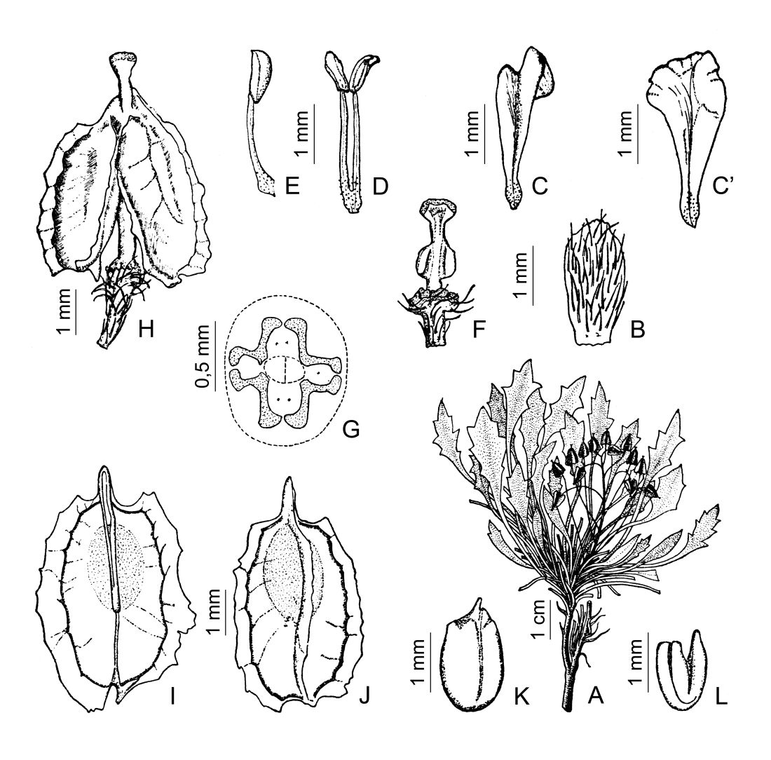 A. Planta. B. Sépalo. C y C’. Pétalos. D-E. Estambres. F. Gineceo. G. Esquema de nectarios. H. Silícula. I-J. Valvas. K. Semilla. L. Embrión.
