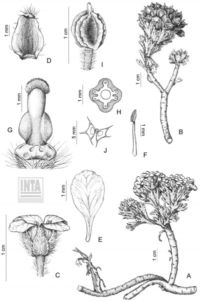 Hierbas perennes con tallos subterráneos gruesos, carnosos y ramificados. Tallos aéreos de (3,5-)5-15(-30) cm de alto, carnosos, erectos a subdecumbentes, generalmente sin ramificar en la parte superior, con numerosas cicatrices foliares, esparcida a densamente pubescentes con tricomas simples, aplanados y tortuosos de 1-2(-3) mm de largo, raramente glabros o glabrescentes. Hojas sólo caulinares, subsésiles; láminas cuneadas, profundamente 3-5(-7)-lobadas, de (6-)8-18(-25) × (3-)5- 10(-13) mm, densamente pubescentes a glabrescentes o raramente glabras, cuneadas, diferenciadas o no en pecíolo y lámina, márgenes enteros, lóbulos agudos hacia el ápice. Racimos terminales, ebracteados o menos frecuentemente con las flores inferiores bracteadas, corimbosos, densos, no elongados en la fructificación, superando sólo levemente a las hojas adyacentes, de (1,5-)2-4 cm de largo; raquis recto, usualmente pubescente o glabrescente; pedicelos fructíferos ascendentes a divaricados, usualmente rectos, de (8-)10-15(-20) mm de largo, glabros o pubescentes. Sépalos oblongos, de (3-)4-5 × 1,5-2(-2,5) mm, pubescentes o glabros, erectos, no sacciformes, persistentes, con márgenes escariosos; pétalos blancos, en ocasiones algo purpúreos hacia la base, espatulados a anchamente espatulados, de (5-)6-8(-9) × (1,5-)2,5-3,5(-4,5) mm, con uña diferenciada, sin papilas en la base, ápice redondeado; estambres tetradínamos; filamentos libres, erectos, dilatados y sin papilas en la base, de 3-4(-4,5) mm de largo; anteras angostamente oblongoides, de 1- 1,5 mm de largo; glándulas nectaríferas confluentes en forma de anillo, rodeando la base de todos los filamentos. Frutos suborbiculares, glabros o menos frecuentemente pubescentes; valvas 3-aladas, con los nervios transversales conspicuos, de 5- 8 mm de diámetro; alas de (1-)1,5-2(-2,3) mm de ancho; ginóforo de (0,5-)1-2(-3) mm de largo; estilo de 1-2(-2,8) mm de largo; estigma levemente decurrente. Semillas ovoides, de 2,8-3,2 x 1,8-2 mm, no aladas, aplanadas; cotiledones acumbentes.