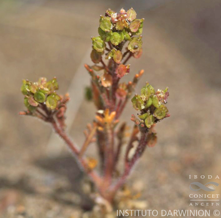 Hierbas anuales, con raíz primaria axonomorfa conspicua. Tallos aéreos de 1,5-14 cm de alto, 1 a varios ramificándose desde la base, erectos a subdecumbentes, ramificados en la parte superior, esparcidamente hirsutos con tricomas simples, teretes y rectos de 0,4-0,6 mm de largo. Hojas basales y caulinares, las basales subrosuladas; láminas de contorno anchamente espatulado a oblongo, de márgenes levemente pinnatilobados a repandos, de 3-30 mm de largo, esparcidamente hirsutas con tricomas teretes y antrorsos; hojas caulinares reducidas en tamaño hacia la zona apical. Racimos terminales, raramente axilares, bracteados al menos en las flores inferiores, corimbosos, elongados en la fructificación, de 2-8 cm de largo; raquis recto, piloso a esparcidamente hirsuto; pedicelos fructíferos divaricados, rectos, de 3-6 mm de largo, hirsutos. Sépalos oblongos, de 1,5-2 × ca. 1 mm, caducos, esparcidamente hirsutos, erectos, no sacciformes, de márgenes membranáceos; pétalos blancos, espatulados, de 1,5-3(-3,5) × 0,6-1(-1,5) mm, con uña diferenciada; estambres ligeramente tetradínamos; filamentos libres, erectos, dilatados y con papilas en la base, de 1-1,5(-1,8) mm de largo; anteras ovoides, de 0,3-0,6 mm de largo; glándulas nectaríferas confluentes. Frutos suborbiculares, glabros; valvas conspicuamente convexas en la cara adaxial y fuertemente cóncavas en la abaxial, cupuliformes a globosas en sección transversal, 2-aladas, de (2,5-)3-5 × (2-)3-4 mm, emarginadas en ápice y base; alas extendiéndose en dirección contraria al replum o reflexas y entonces formando una cavidad casi completamente cerrada, de 0,4-1 mm de ancho, ligeramente onduladas a rectas; ginóforo obsoleto, no mayor de 0,25 mm de largo; estilo de (0,8-)1- 1,5 mm de largo; estigma levemente decurrente. Semillas ovoides, de 1,5-1,7 x 1-1,3 mm, ligeramente aplanadas, cotiledones acumbentes