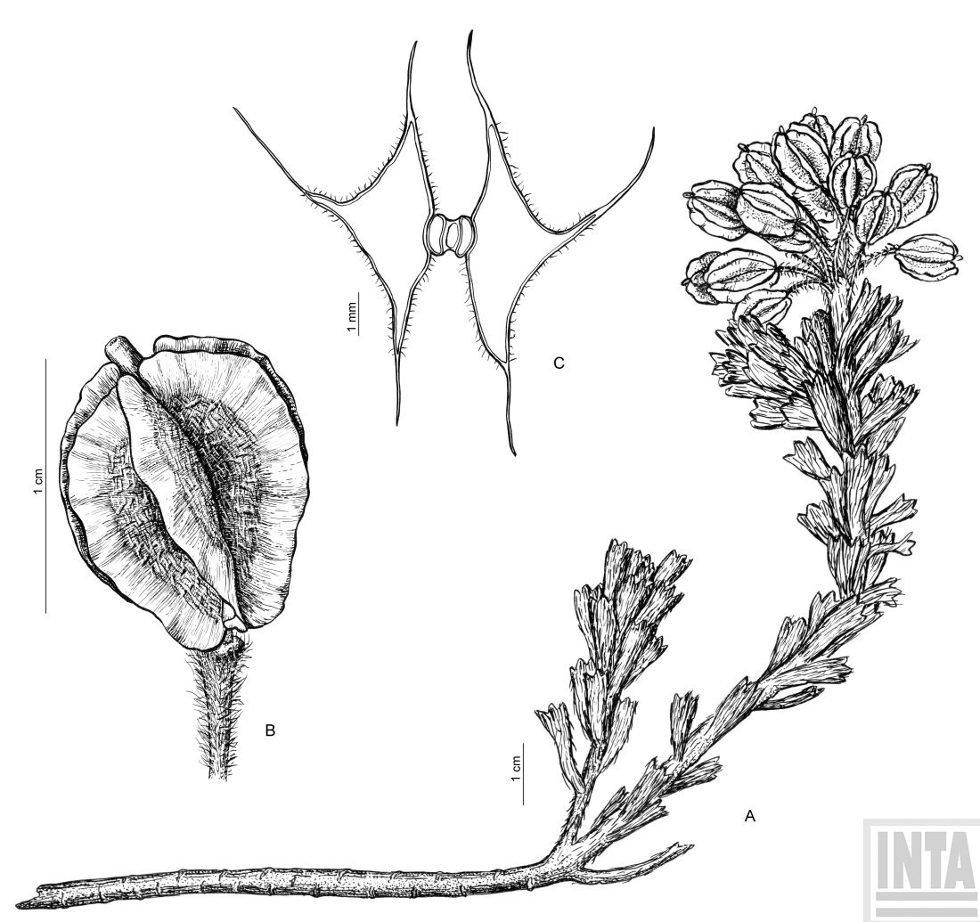 Hierbas perennes, con tallos subterráneos carnosos a leñosos, ramificados. Tallos aéreos de (6-)9-25(-30) cm de alto, carnosos o más frecuentemente leñosos, gruesos, erectos, generalmente sin ramificar en la parte superior, con numerosas cicatrices foliares, pubescentes a canescentes con tricomas simples, teretes, rectos y retrorsos o más raramente extendidos a antrorsos, de 0,5-1,2 mm de largo. Hojas sólo caulinares, subsésiles, cuneadas, de 7-18(-25) × (3-)5-8 mm, canescentes, generalmente con tricomas retrorsos o en ocasiones antrorsos a extendidos sobre la cara adaxial, cuneadas a atenuadas, márgenes enteros, ápice 3-lobado a dentado. Racimos terminales, ebracteados o más frecuentemente con las flores inferiores bracteadas, corimbosos, densos, levemente elongados en la fructificación, de 3-6 cm de largo; raquis recto, canescente; pedicelos fructíferos ascendentes a divaricados o reflexos, rectos a recurvos, de (6-)8-14 mm de largo, densamente pubescentes, con tricomas extendidos. Sépalos oblongos, de 4-6 × 2-2,5 mm, pubescentes, erectos, no sacciformes, caducos, de márgenes escariosos; pétalos blancos, espatulados a anchamente espatulados, de 6,5-9 × 1,5-3,5 mm, con uña diferenciada, sin papilas en la base; estambres tetradínamos; filamentos libres, erectos, dilatados y sin papilas en la base, de 3-5,5 mm de largo; anteras angostamente oblongoides, de 1,2-2 mm de largo; glándulas nectaríferas confluentes en forma de anillo, rodeando la base de todos los filamentos. Frutos suborbiculares, pubescentes, con tricomas extendidos; valvas 3-aladas, con nervios transversales conspicuamente marcados, de 9-13(-14) × 7-12 mm, emarginadas apicalmente; alas de 1,5-5(-2,7) mm de ancho; ginóforo de 1,5-2(-3) mm de largo; estilo de 2-3 mm de largo; estigma ligeramente decurrente. Semillas ovoides, ca. 4 × 3 mm, no aladas, aplanadas; cotiledones acumbentes.