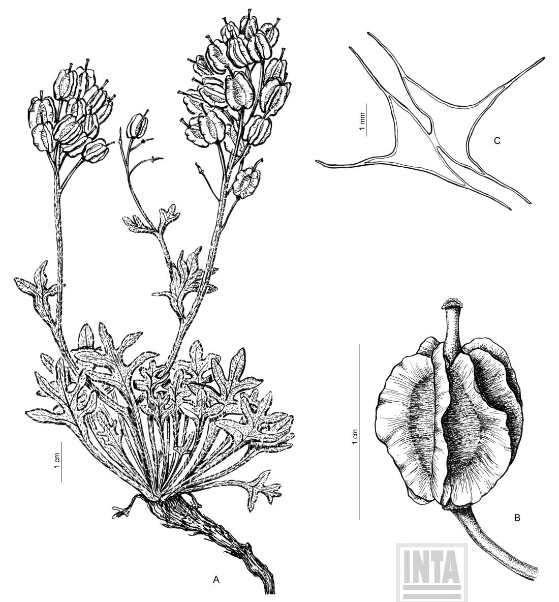 Hierbas perennes, escaposas o no, con cáudices leñosos simples o ramificados. Tallos aéreos de (3-)6-40(-52) cm de alto, erectos, 1 a varios ramificándose desde la base, simples o ramificados en la parte superior, esparcida a densamente hirsutos con tricomas simples, teretes y antrorsos a extendidos, de 0,4-0,9 mm de largo. Hojas basales largamente pecioladas, pecíolos de (1-)2-10(-12) cm de largo, rosuladas; láminas de contorno oblanceolado, pinnatífidas a pinnatilobadas, de (0,7-)2-10(-15) × (0,3-)0,6-3,5(-5) cm, hirsutas, lóbulos oblongos a ovados, obtusos a redondeados; hojas caulinares presentes o ausentes, si presentes pecioladas a subsésiles, menores que las basales. Racimos terminales y menos frecuentemente axilares, ebracteados, densos, corimbosos, elongados en la fructificación, de 3-15 cm de largo; raquis hirsuto, recto; pedicelos fructíferos divaricados a ascendentes, de 5-15 mm de largo, rectos, hirsutos, delgados, conspicuamente extendidos hacia el ápice. Sépalos ovados a oblongos, de (1,7-)2-5 × (1-)1,5-3 mm, hirsutos, erectos, no sacciformes, caducos, de márgenes membranáceos; pétalos blancos a blanco-cremosos, lineares, angosta a anchamente espatulados o obovados, de (2,4-)3,4-9(-10,5) × 1,4- 2,5 mm, con uña leve a conspicuamente diferenciada, con numerosas papilas en la base; estambres tetradínamos; filamentos erectos, dilatados y densamente papilosos en la base, de (1,4-)2,2- 7,4 mm de largo, los de los pares internos connados desde la base hasta 1/3-4/5 de su tamaño; anteras oblongoides, de 0,8- 1,4 mm de largo; glándulas nectaríferas confluentes, rodeando la base de todos los filamentos. Frutos suborbiculares, glabros; valvas 3, menos frecuentemente 5-aladas, con nervios transversales tenues, de (3,5-)4-10 × 3,2-8(-9) mm; alas laterales y dorsal similares, enteras, rectas o ligeramente onduladas, de 0,5-2 mm de ancho; ginóforo de 0,5-3 mm de largo; estilo de 1-3 mm de largo; estigma capitado. Semillas oblongoides, de 2,5-3,5 × 1,5-2 mm, no aladas, globosas a ligeramente comprimidas; cotiledones oblicuamente incumbentes.