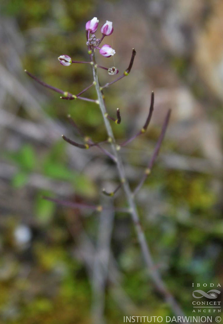 Plantas bienales o perennes de vida corta. Tallos de 12-8 cm de alto, erectos, 1 a numerosos desde la base, glabros o escasamente pubescentes, con tricomas pedunculados, dendríticos o bifurcados. Hojas basales usualmente rosuladas; pecíolos de 2- 10 mm de largo; láminas oblongas a oblongo-oblanceoladas, de (1,2-)2,5-4,5(-6,5) × 0,3-1,6(-2,2) cm, escasa a densamente pubescentes, con tricomas pedunculados, dendríticos y/o 2-radiados, ápice obtuso o rara vez subagudo, margen entero a denticulado; hojas caulinares lineares, de margen entero a denticulado. Racimos laxos, ebracteados, alargados durante la fructificación; pedicelos fructíferos divaricados, rectos, de (0,7-)1-2(-2,5) cm de largo. Sépalos ampliamente ovados, de color púrpura a lavanda, ligeramente extendidos, caducos, de 2-3 × (1,3-)1,5-1,7 mm de largo, escasamente pubescentes cerca del ápice, margen escarioso; pétalos espatulados, blancos, lámina no diferenciada de la uña, de 3-4 × 1-1,5 mm de largo; filamentos blancos, de 2,5- 3 mm de largo; anteras ovoides, ca. 0,6 mm de largo, de base sagitada; óvulos 76-108. Frutos estrechamente lineares, de 2- 3,5(-4,5) cm × 1-1,3 mm; valvas glabras, con un nervio central prominente; estilo de 0,4-0,8(-1,5) mm de largo; estigma entero. Semillas sub 2-seriadas, oblongoides, de 0,7-0,9 × 0,4-0,5 mm; cotiledones incumbentes.