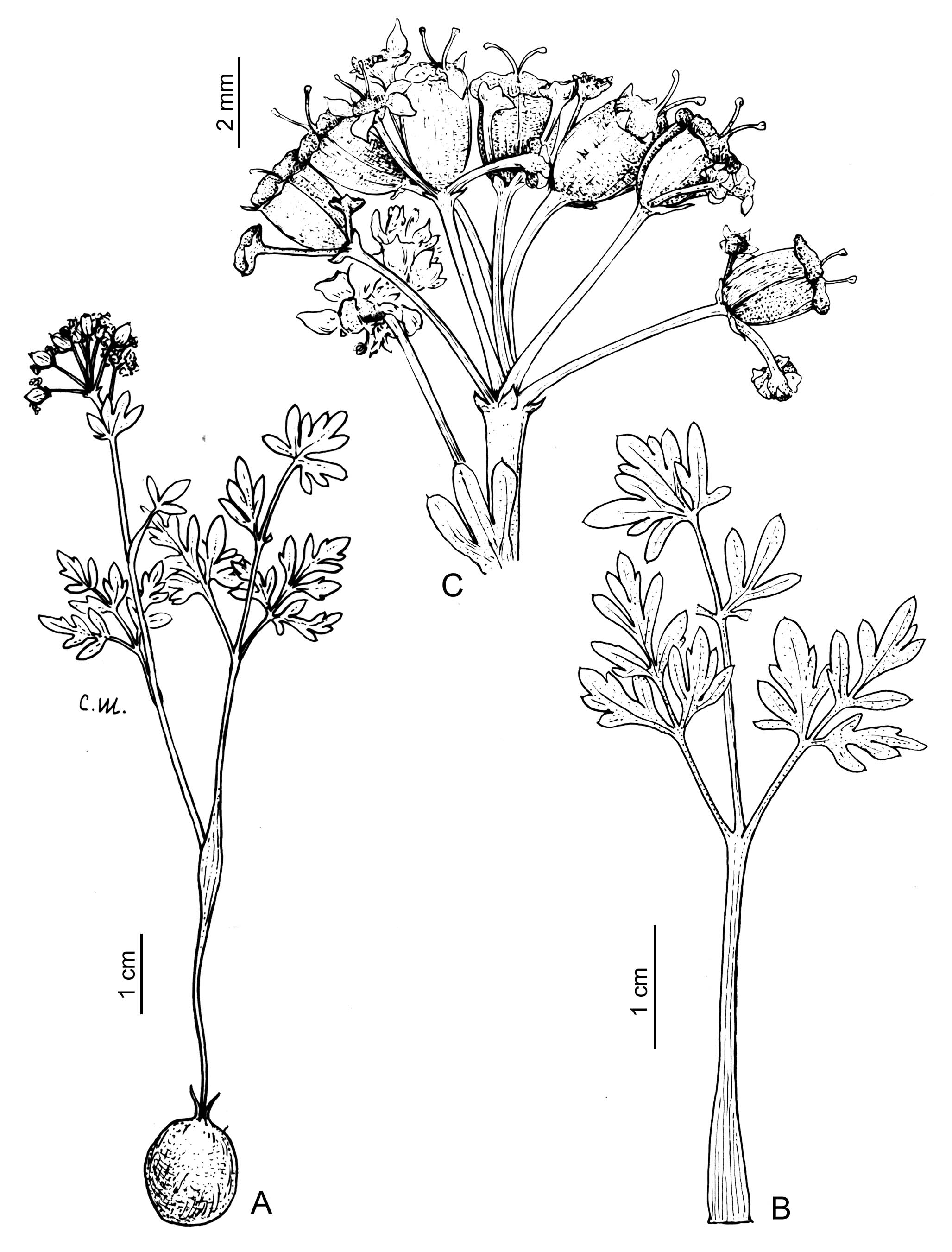 Hierbas de 9-28 cm de alto, a partir de una raíz tuberosa, globosa, de 1,5-3 cm de diámetro. Hojas de 2,5-9 × 2,5-8 cm, ternadas, folíolos estipitados, bilobulados, últimos lóbulos angostamente elípticos a lineares, obtusos, de 4-10 × 1-3 mm, mucronados; peciolos de 2-4 cm de largo, delgados, dilatados en la base en una vaina ancha; hojas caulinares pocas, las superiores bractiformes. Dicasios trifloros pedunculados (formados por 2 flores estaminadas pediceladas y una perfecta, subsésil), agrupados en una inflorescencia umbelada, terminal y 1-2 axilares; pedúnculos de 1-5 cm de largo; involucro formado por un par de brácteas opuestas, inconspicuas. Flores con dientes del cáliz evidentes, morados; pétalos blancos con tintes rosados, anchamente ovados, estipitados, de 1,5-2 mm de largo; pedicelos de 2-3 mm de largo en las flores estaminadas. Frutos anchamente ovoides, alados, de 5-8 × 5-8 mm.