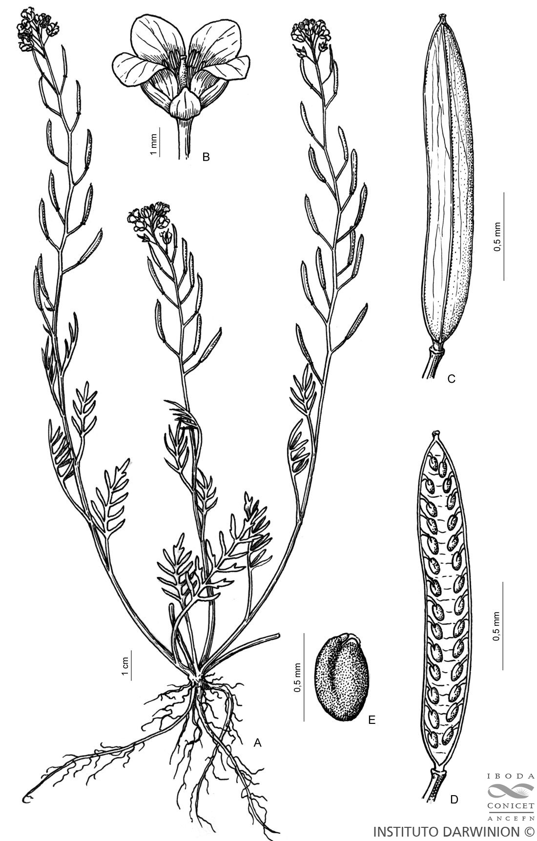 Hierbas anuales, glabras; tallos de (5-)10-35(-50) cm de alto, erectos a ocasionalmente subdecumbentes, solitarios, rara vez algunos pocos desde la base, a menudo ramificados en la parte superior, flexuosos o rectos. Hojas basales tempranamente marchitas, pinnatisectas, de 3-10 cm de largo; pecíolos de 1-5 cm de largo; lóbulos laterales 4-7 a cada lado, filiformes a lineares, rara vez linear-oblongos, enteros o dentados, de 0,5-1,5 cm × 0,3- 1,5 mm, a menudo tan anchos y tan largos o ligeramente menores que el lóbulo terminal; hojas caulinares fuertemente auriculadas, similares a las basales, más pequeñas, menos lobuladas, las superiores a menudo linear-lanceoladas a lineares o filiformes, usualmente enteras. Racimos (20-)30-60(-70)-floros, corimbiformes, ebracteados, alargados considerablemente durante la fructificación; pedicelos fructíferos delgados, rectos, divaricados a horizontales, rara vez ascendentes, de (2-)4-7(-9) mm de largo, glabros. Sépalos erectos, ovados a ampliamente oblongos, glabros, caducos, margen membranáceo, no sacciformes, de 1-1,5 mm de largo; pétalos blancos, oblanceolados, de 2-3(-3,5) × 0,7-1 mm; filamentos erectos de 1-1,5 mm de largo; anteras ovoides, ca. 0,5 mm de largo; óvulos (50-)60-120. Frutos lineares a linearoblongoides, ligeramente aplanados, de (6-)9-16(-20) × (1-)1,2- 1,7(-2) mm, más angostos apicalmente, no constreñidos entre las semillas, rectos, a menudo nervados; septo completo; estilo de 0,05-0,4(-0,8) mm de largo; estigma entero. Semillas 2-seriadas, oblongoides a oblongo-ovoides, castañas a castaño-rojizas, diminutamente reticuladas, distalmente apiculadas a angostamente aladas, de 0,5-0,9(-1,1) × 0,3-0,4(-0,6) mm.