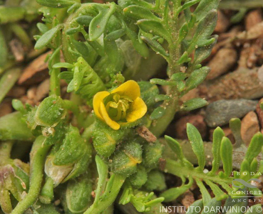 Hierbas perennes, glabras. Tallos de (0,5-)2-10(-15) cm de alto, postrados o rara vez erectos, solitarios o algunos pocos desde la base. Hojas basales pinnatisectas, de (1,5-)2,5-7(-10) cm de largo; pecíolos de 0,5-2(-4) cm de largo; lóbulos laterales 5-9 a cada lado, oblongos a ovados, enteros o lobulados, 1- dentados a cada lado o proximalmente, de 2-6(-11) × 0,5-2(-4) mm; hojas caulinares similares a las basales, más cortas, pecioladas, no auriculadas. Racimos 3-12-floros, corimbiformes, ebracteados o sólo las flores más basales bracteadas, alargados o no durante la fructificación; pedicelos fructíferos delgados, divaricados, de (0,5-)1,5-4(-6) mm de largo, glabros. Sépalos erectos, ovados, glabros o dorsalmente papilosos, persistentes hasta después de la madurez del fruto, margen membranáceo, no sacciformes, de 2-3 mm de largo, ligeramente más largos durante la fructificación; pétalos amarillos, obovados, de 2,5-4 × 1-2 mm; filamentos erectos, de 1,5-2 mm de largo; anteras ovoides, de 0,3-0,6 mm de largo; óvulos 50-80. Frutos ovoides a lanceolados, teretes, de 5-11 × 2-4 mm; septo completo; estilo de 0,5-2 mm de largo; estigma entero. Semillas 2-seriadas, ovoides, ligeramente aplanadas, castaño claro a amarillo pálido, coliculadas, de 0,7-1,1 × 0,5-0,7 mm.